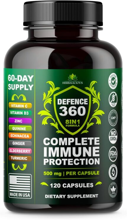 Defence360 Immune Support 8-in-1 Supplement with Vitamin C, D3, Zinc, Elderberry, Echinacea, Turmeric, Ginger & Quinine, Immune Protection, Energy and Vigor, Brain Boost, Stress Relief (120 Capsules)