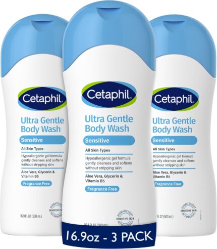 Cetaphil Ultra Gentle Body Wash, For Dry to Normal, Sensitive Skin, 16.9oz Pack of 3, Aloe Vera, Vitamin B5, Hypoallergenic, Paraben Free, Fragrance Free, Dermatologist Tested