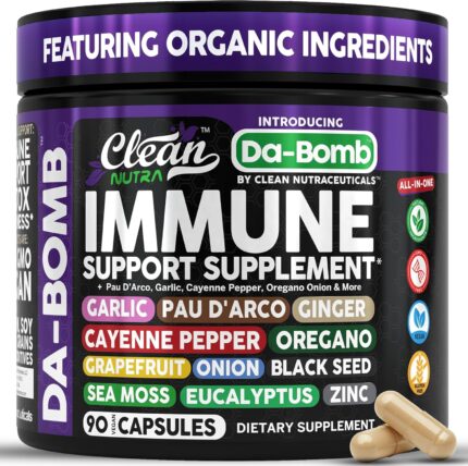 Organic Immune Support with PAU D’Arco Garlic Cayenne Pepper Oregano Ginger Grapefruit Onion Black Seed Sea Moss Black Pepper Zinc Eucalyptus Vitamin C Vitamin D Organic Soursop by Clean Nutra