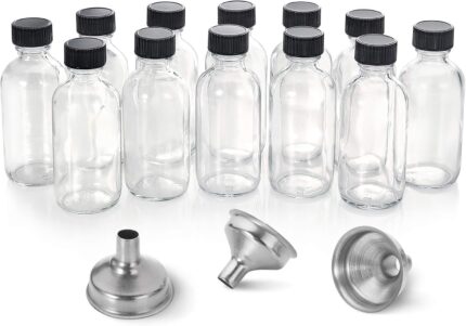 12 Pack, 2 oz Small Clear Glass Bottles w/Lid & 3 Funnels – 60ml Boston Shot Bottles for Health, Immunity, Potion, Wellness, Sample, Ginger, Juice – Mini Personal Care & Beauty Travel Bottle