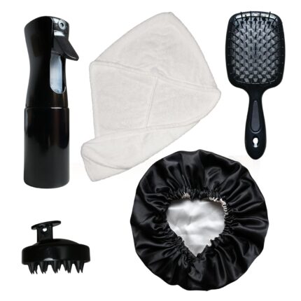 Curly Hair Essentials Set – Mist Spray Bottle For Styling, Detangler Brush, Scalp Massager For Hair Growth, Silicone Scrubber, Turban Towel For Women, Microfiber Wrap, Satin Sleeping Bonnet