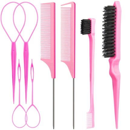 Aigee 8Pcs Hair Styling Combs Set Include 4Pcs Topsy Hair Tail Tools 2 Styles of Rat Tail Comb,1Pcs Bristle Teasing Slick Back hair Brush,1Pcs Edge Control Brush,Eyebrow Brush for Woman Girl Pink