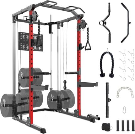 GarveeHome 2000 LBS Power Cage, Squat Rack, Multifunctional Weight Cage with Cable Crossover System and LAT Pulldown, Workout Cage with Adjustable Safety Bars for Home Gym, Red
