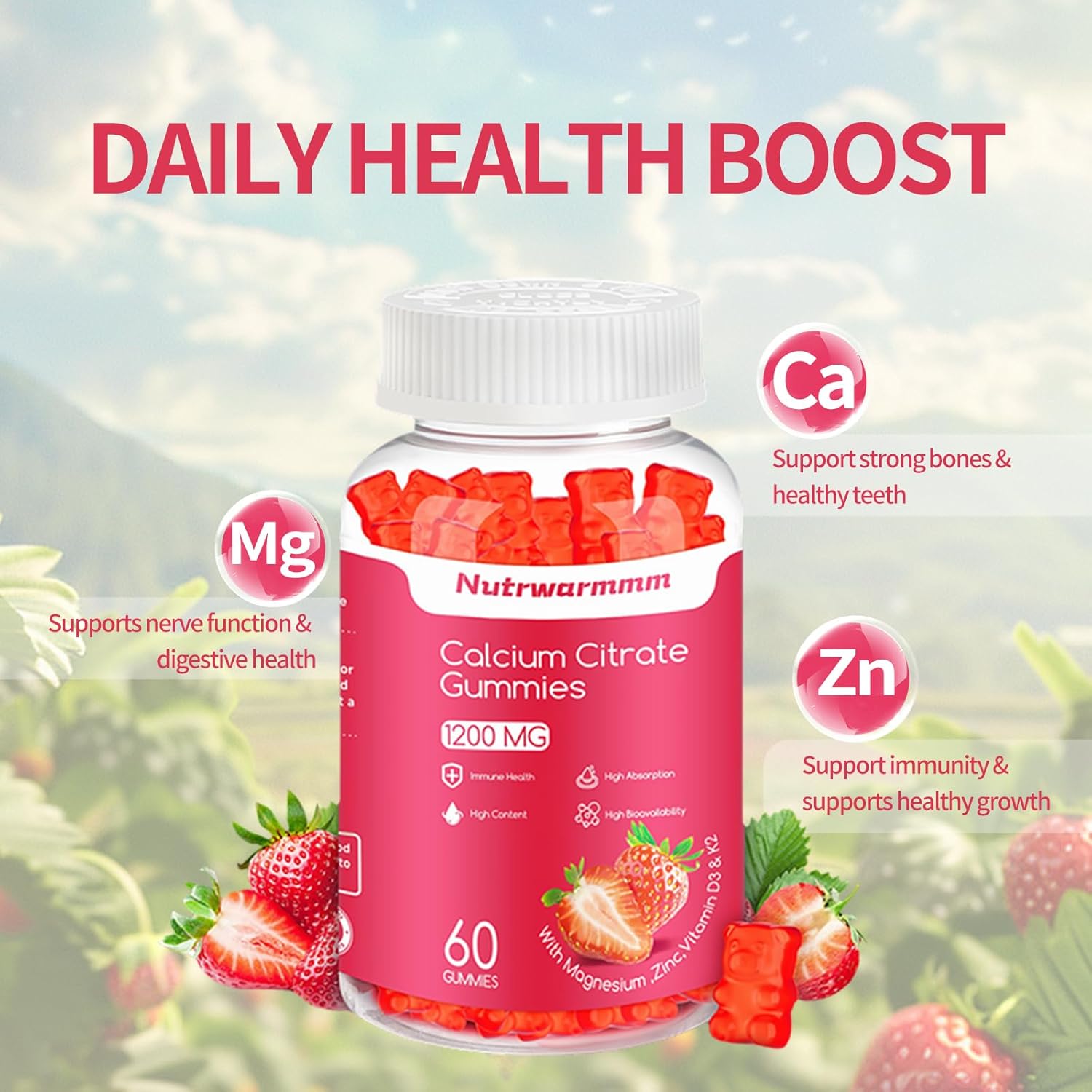 1200mg Calcium Citrate Gummies with Vitamin D3 for Women & Men, Sugar Free Chewable Calcium Supplements, Support Bone, Muscle & Immune, Strawberry Flavor