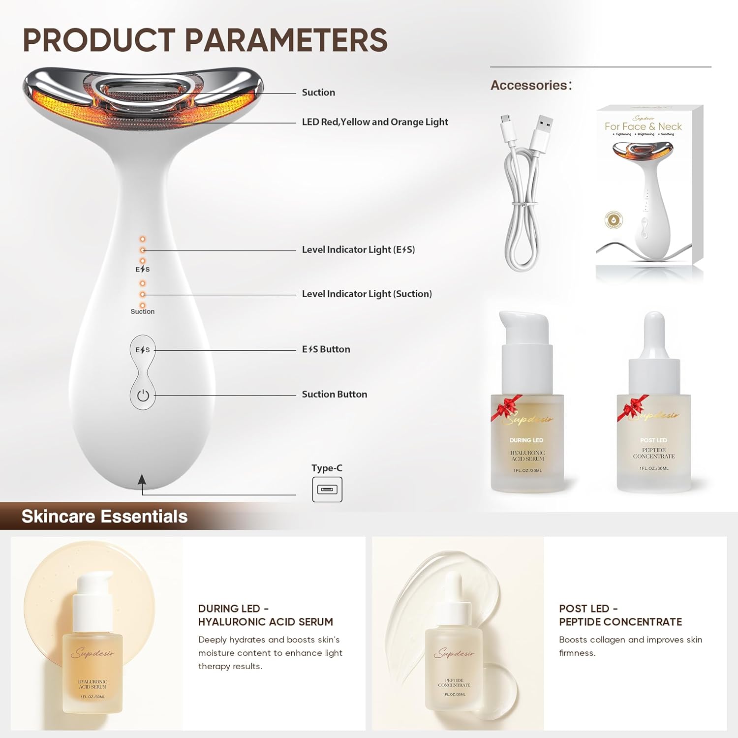 Tightening, Brightening, Soothing: Enjoy a comfortable face and neck massager at home! This facial massager has gentle vibration massage and suction mode with mild heating and LED light therapy (red, yellow, and orange light) to improve elasticity and combat fine lines and wrinkles, tech neck, puffiness, and uneven skin tone.
