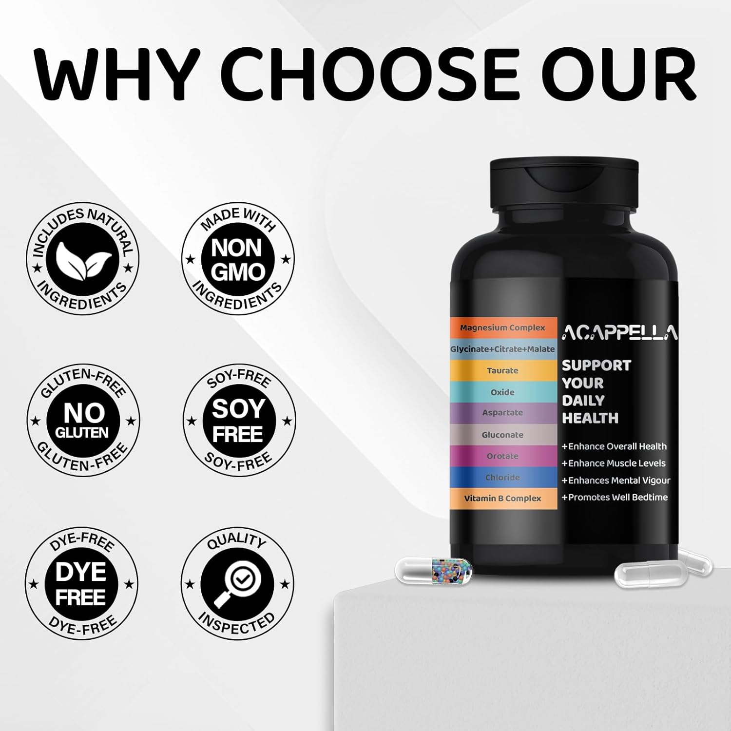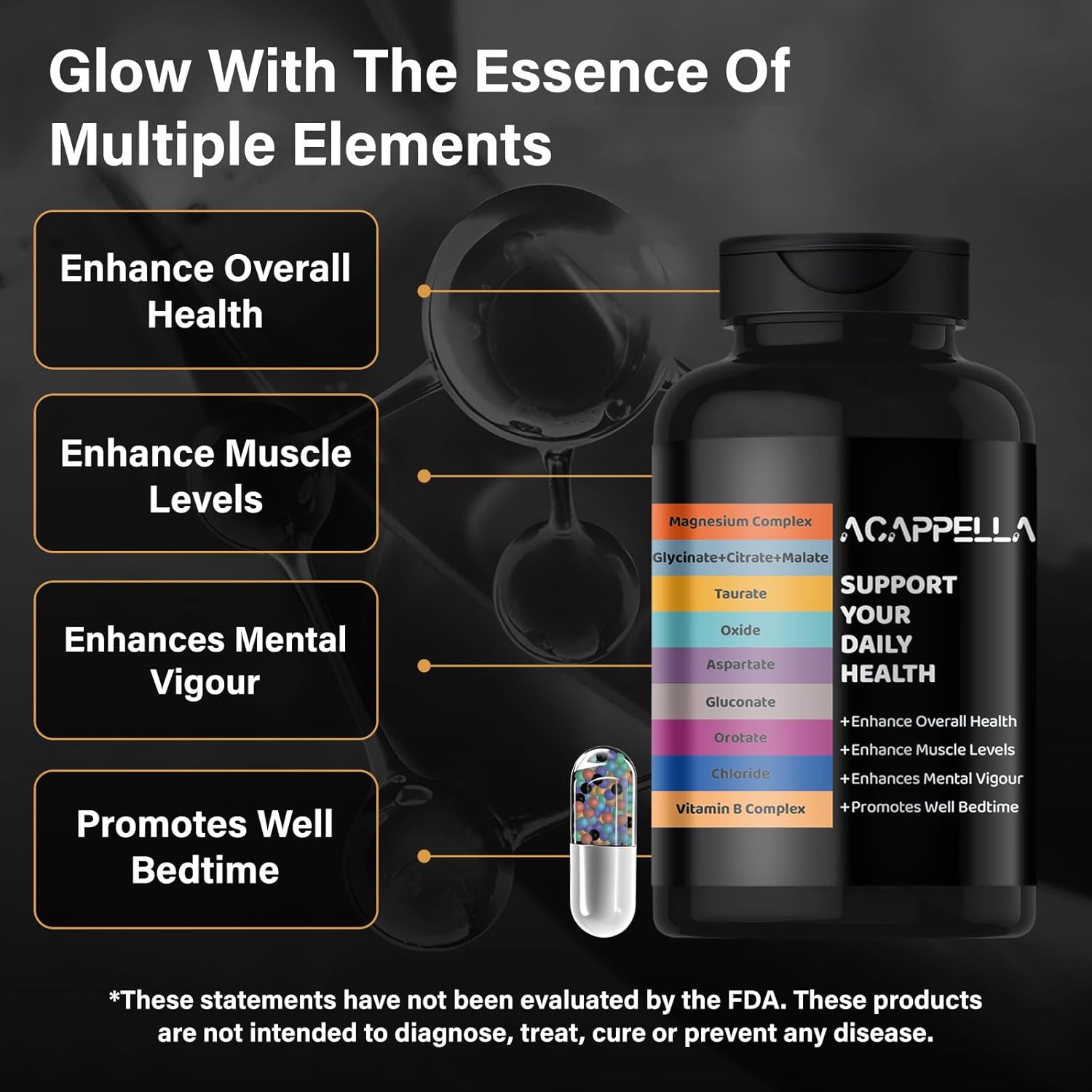 Introducing the ACAPPELLA Blend – Capsule vitamin b complex for women, magnesium glycinate 200mg capsule, capsule b complex vitamins for men, citrato de magnesio 1000mg capsules and magnesium malate supplements capsule that contain additional powerhouse ingredients, magnesium oxide 200mg capsule, capsule b vitamins complex for women, magnesium citrate 400mg capsule and more! These organic magnesium glycinate capsule are alternatives to magnesium choloride capsule, magnesium taurate and glycinate capsule.