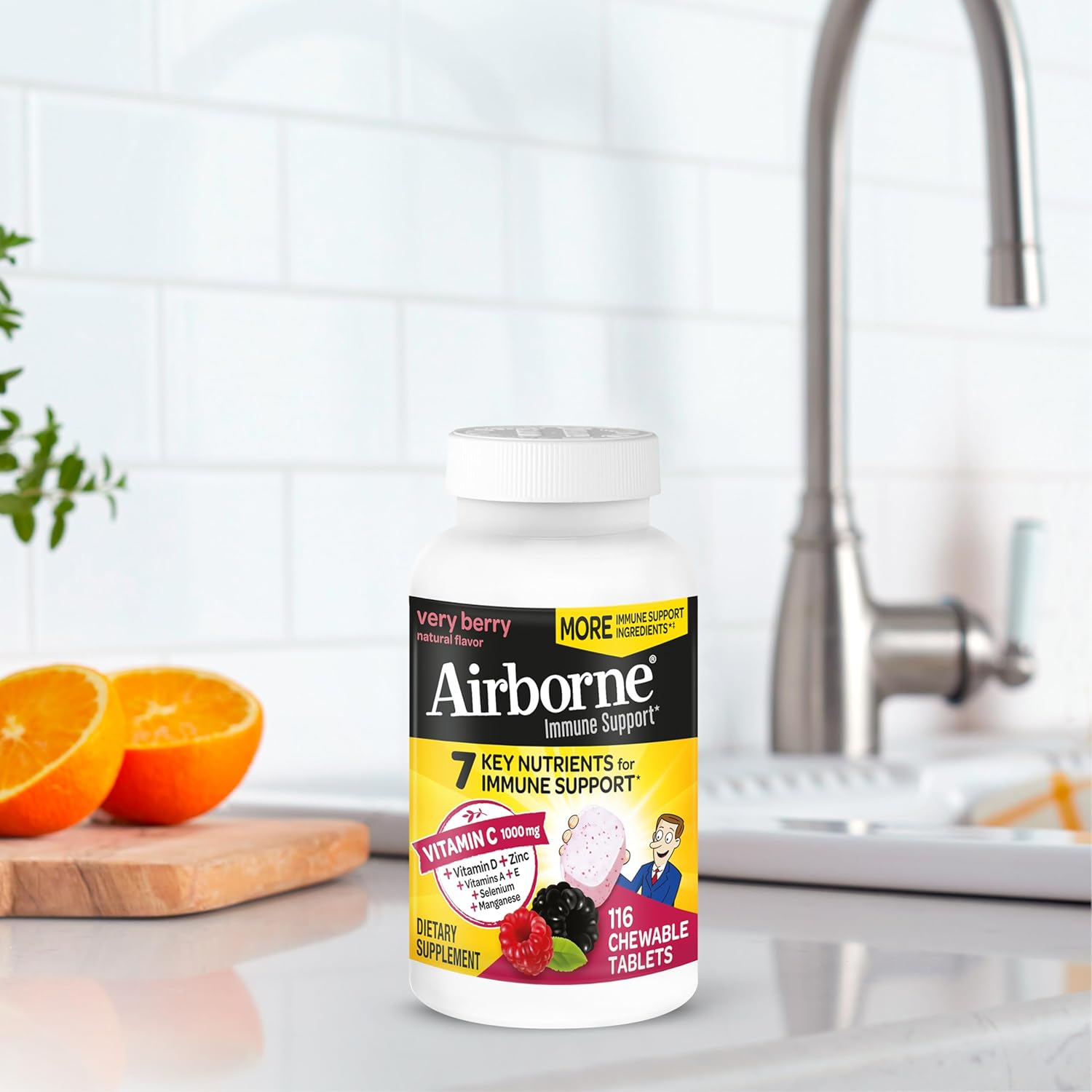 Airborne Vitamin C 1000mg (per Serving) – Very Berry Chewable Tablets (116 Count in a Bottle), Gluten-Free Immune Support Supplement, with Vitamins A C E, Zinc, Selenium, Ginger, Antioxidants