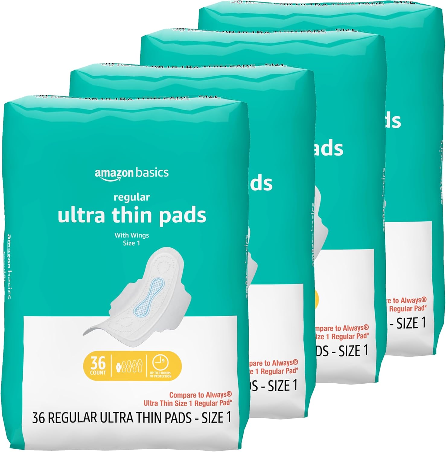Amazon Basics Regular Absorbency Feminine Pads for Women, Ultra Thin with Flexi-Wings, Unscented, Size 1, Absorbent, 144 Count (4 Packs of 36) (Previously Solimo)
