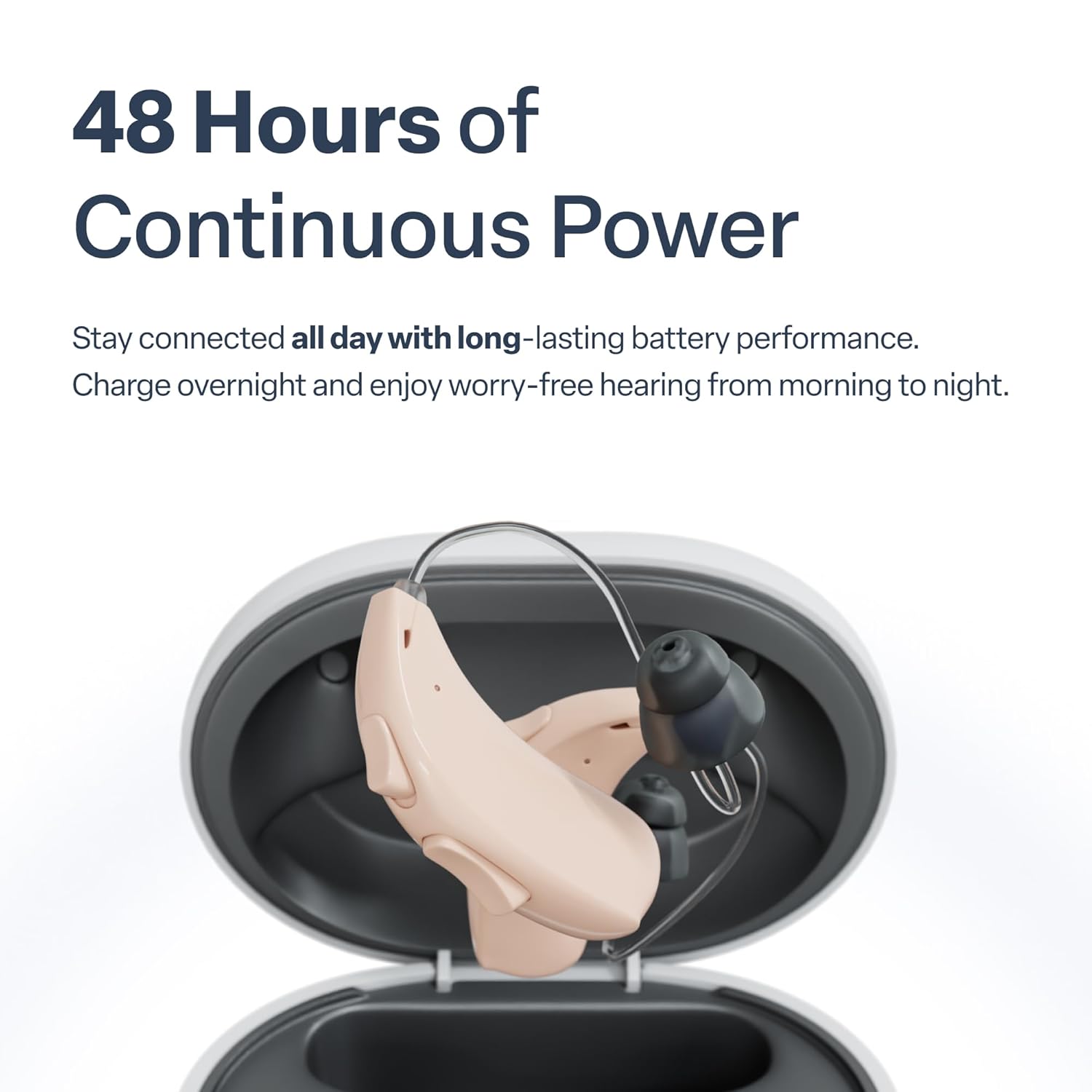 100% Rechargeable – The high quality ION OTC hearing aids are 100% rechargeable with wireless magnetic charging and feature a 20 hour battery life with an approximate 2 hour charging time. The charging case carries up to 3 full charges (60hrs). The devices wirelessly charge when in the case. No more dealing with tiny button batteries, Audien hearing aids are perfect for people who have dexterity issues or are just simply tired of endlessly buying and replacing batteries.