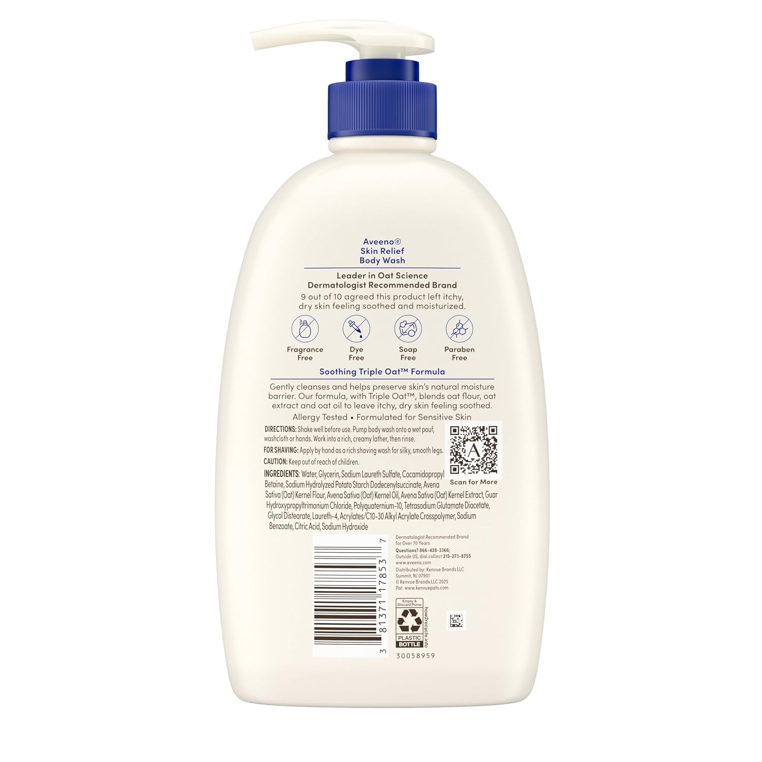 Aveeno Skin Relief Moisturizing Body Wash is fragrance-free and suitable for sensitive skin. Formulated to provide gentle yet effective cleansing for itchy, dry, and sensitive skin. This moisturizing body wash features a Triple Oat Formula, combining oat flour, oat extract, and oat oil to help preserve the skin’s natural moisture barrier. An impressive 93% of users confirm this body wash leaves itchy, dry skin feeling soothed and moisturized. Designed for daily use by both men and women, this gentle daily cleanser is from a dermatologist-recommended brand for over 70 years. Allergy tested, making it ideal for those with sensitive or easily irritated skin seeking a body wash alternative. Free of soap, parabens, dyes, and fragrance-free formula ensures a mild cleansing experience without harsh chemicals. Its creamy, nourishing texture makes it suitable as a shower gel or body soap, and versatile enough to double as a rich shave gel for silky, smooth legs. Whether you’re looking for a women’s body wash, men’s body wash, this product fits seamlessly into any daily skincare routine. For best results, squeeze onto a wet pouf, washcloth, or hands, work into a rich, creamy lather, then rinse. Follow with Aveeno Skin Relief Moisturizing Lotion to lock in moisture for 48 hours. Experience the body wash and lotion formula and enjoy skin that feels softer, smoother and leaves itchy, dry skin feeling soothed and moisturized.