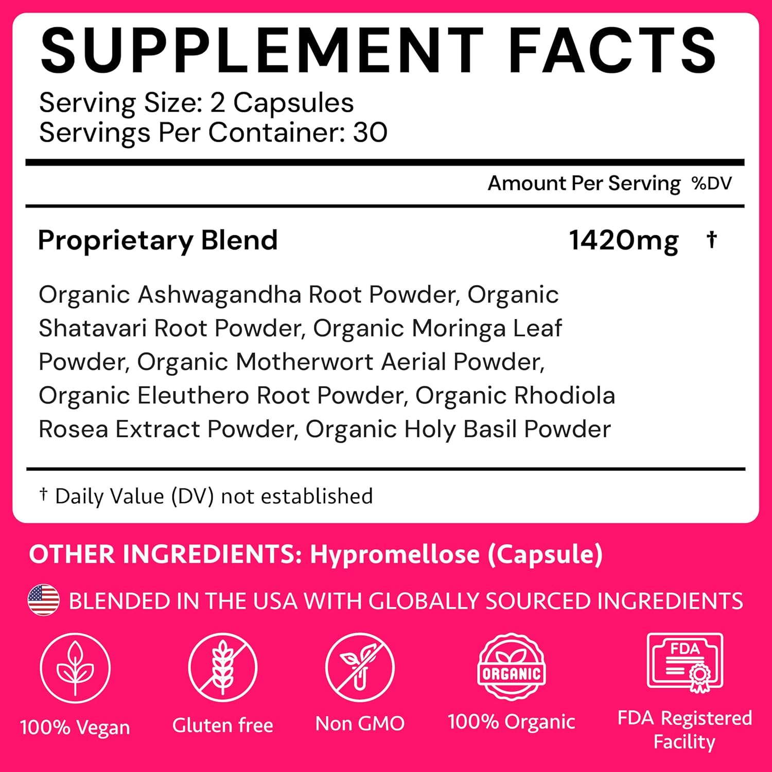 7 POWERFUL ORGANIC INGREDIENTS: Ashwagandha Root Powder, Shatavari Root Powder, Moringa Leaf Powder, Motherwort Powder, Eleuthero, Rhodiola, Holy Basil Powder