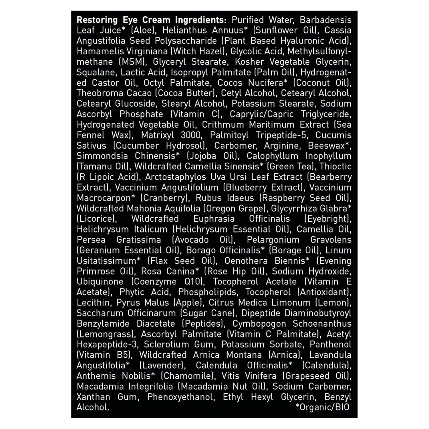 Key Ingredients: Natural & Organic ingredients, including aloe, DMAE, MSM, Plant Stem Cells, Vitamin C, hyaluronic acid, protein peptides, and caffeine.