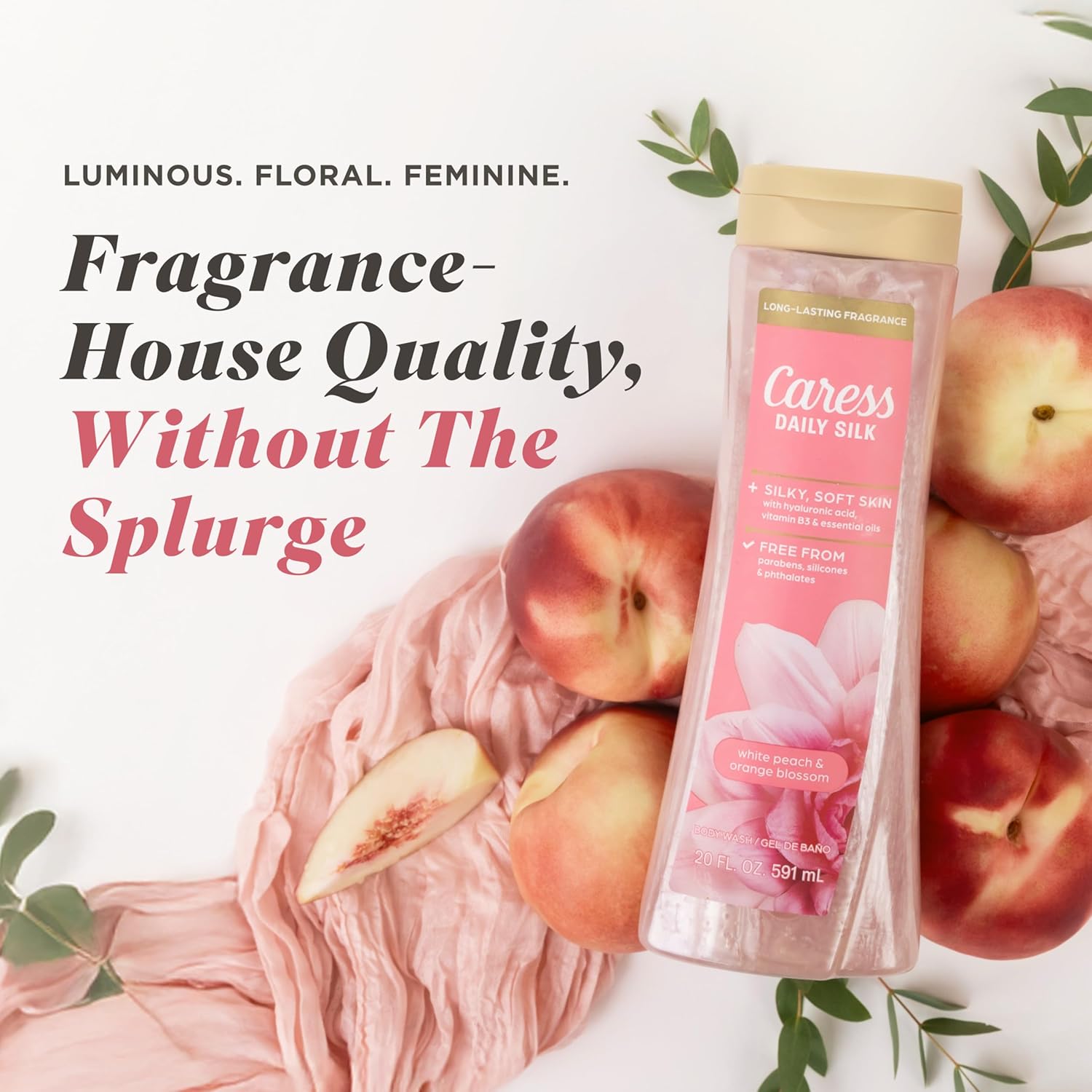 Trends fade. But a signature scent? She stays. Meet your new main character moment: Caress Daily Silk Body Wash. Infused with luxury-grade, long-lasting fragrance, this luxurious body wash immerses your senses in silky lather and lasting scent. One swipe reveals crisp, juicy white peach and bright orange blossom that open with a fresh, inviting burst, unfolding into soft florals that bring a smooth, elegant finish. The lush scent lingers lightly, leaving skin subtly refreshed. Formulated with hyaluronic acid, vitamin B3, and essential oils, this liquid body wash creates rich lather that hydrates and smooths for lotion-soft skin. Gentle enough for sensitive skin, it delivers a gentle cleanse without harshness. The formula is pH balanced, dermatologist tested, free from parabens, silicones, and phthalates. Caress indulges your senses and renews your spirit: it hydrates thirsty skin and keeps you feeling luxuriously clean. Use morning or night, it’s your everything shower essential, upgraded with fragrance that pops, texture that pampers, and skin that glows. So go ahead, lather accordingly. Massage onto skin with your preferred cleansing method and let the scent and softness take over.