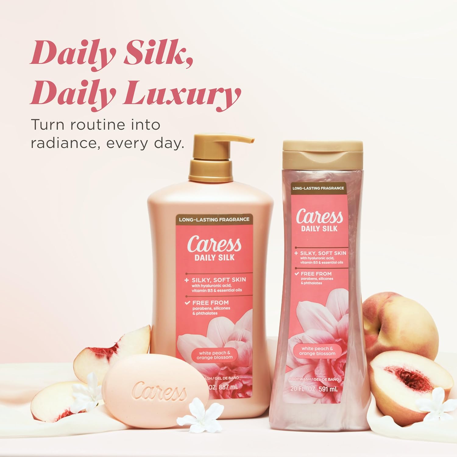 CARESS DAILY SILK – This isn’t just shower soap – it’s a full-body fragrance moment. Infused with crisp zest of white peach & bright sweetness of orange blossom, Caress luxury-grade liquid bath soap wraps you in a lush scent that lasts beyond the shower.