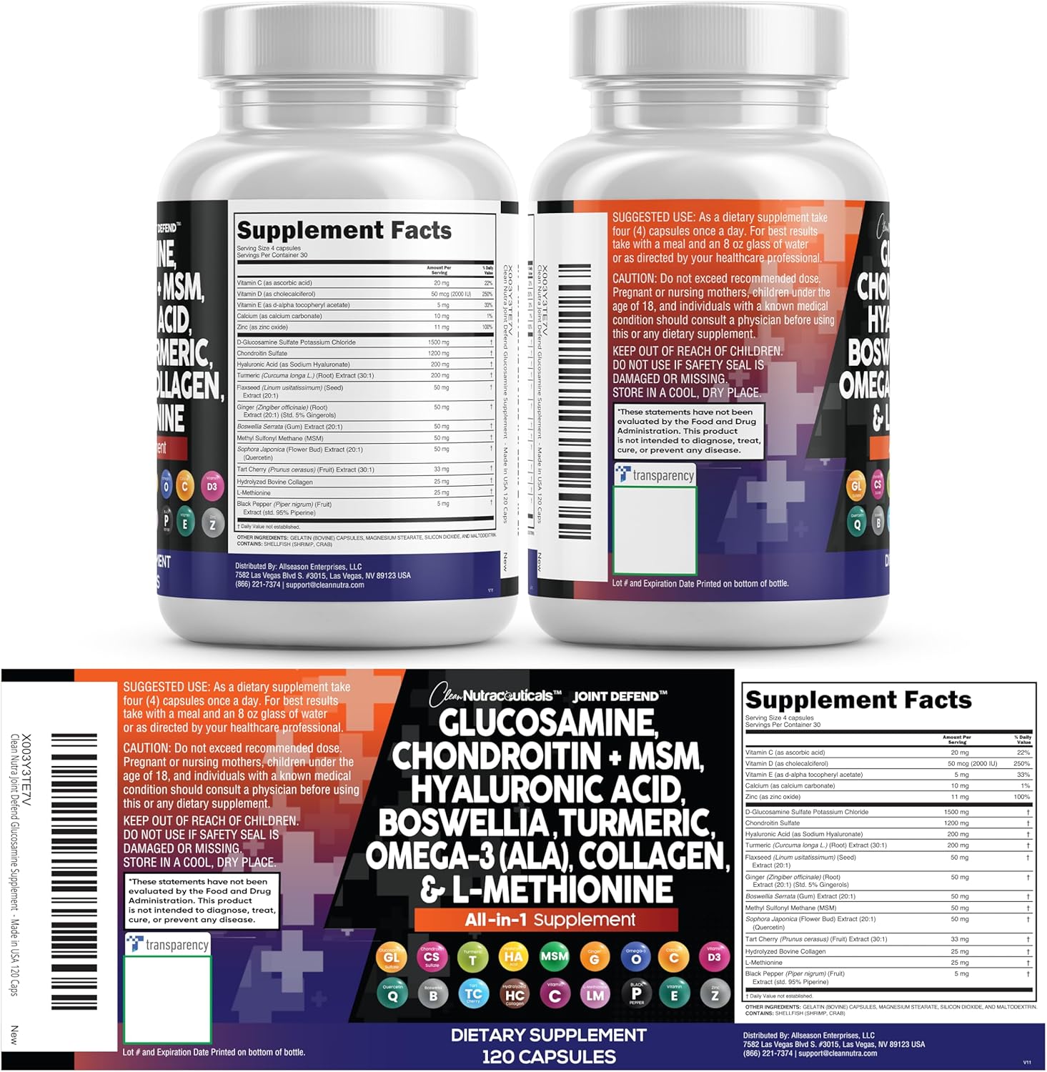 Clean Nutraceuticals Glucosamine Chondroitin MSM 1500mg with Turmeric Curcumin, Collagen, Hyaluronic Acid, Omega 3 – Joint Health Supplement for Men & Women – Joint Complex – 120 Count