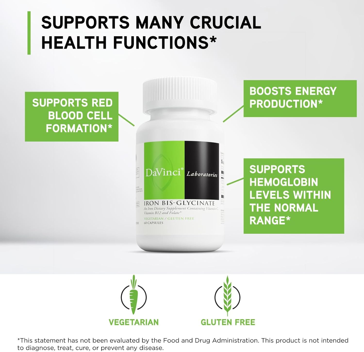 DAVINCI Labs Iron Bis-Glycinate – Gentle Iron Supplement for Women & Men – Help Support Hemoglobin Production & Normal Energy Levels with Vitamin C & More – Vegan – 60 Vegetarian Capsules