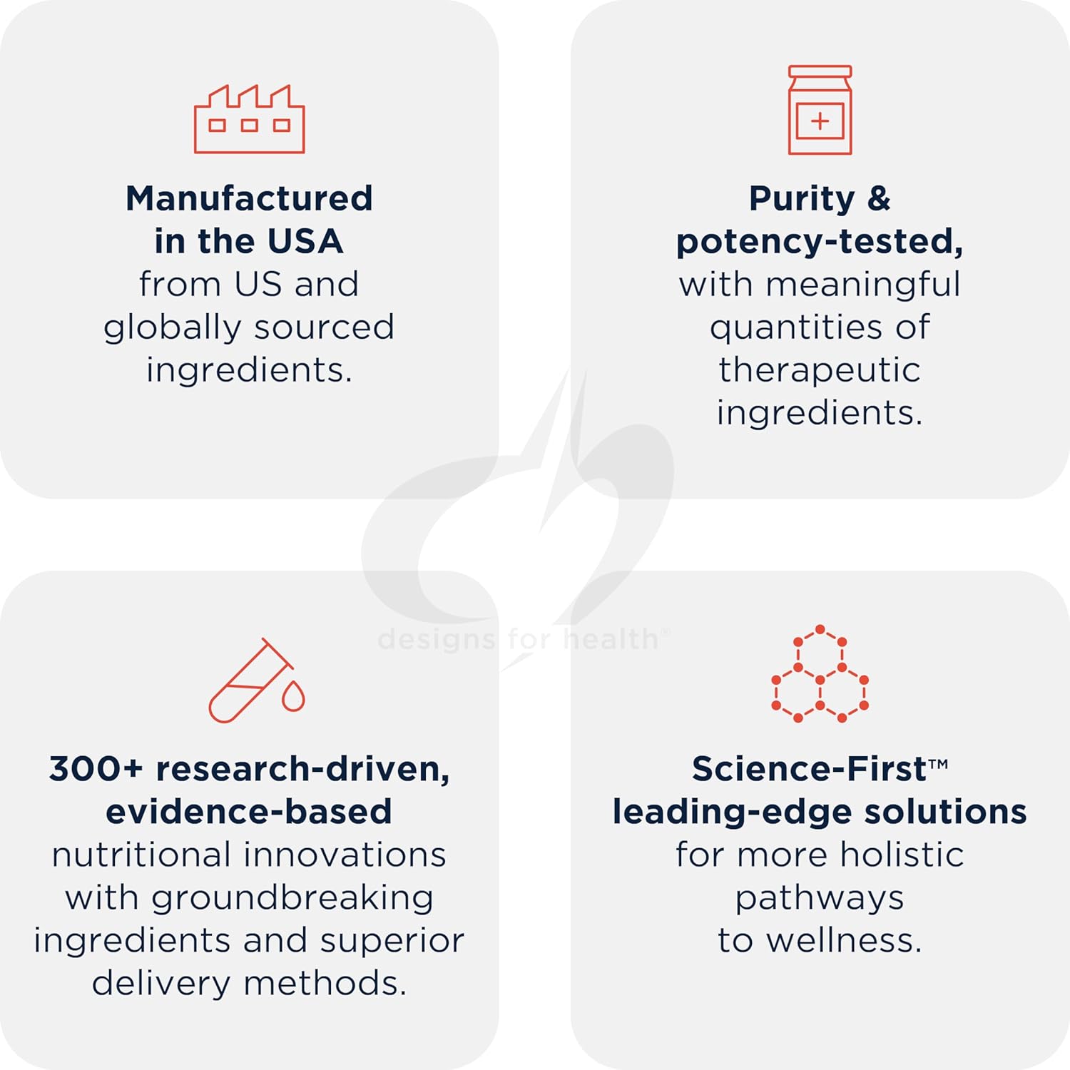 Over 50,000 Doctors Agree – Designs for Health is the physician’s choice for top quality professional strength supplements since 1989. Our “Science First” philosophy ensures our products are based on the most recent research and use the highest quality raw ingredients.