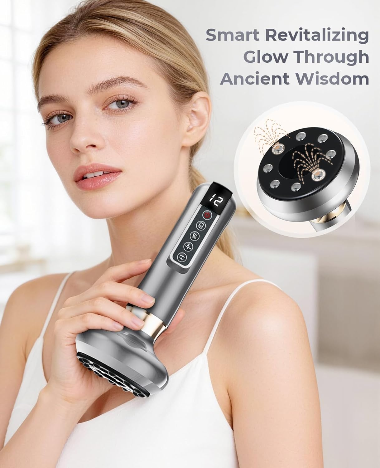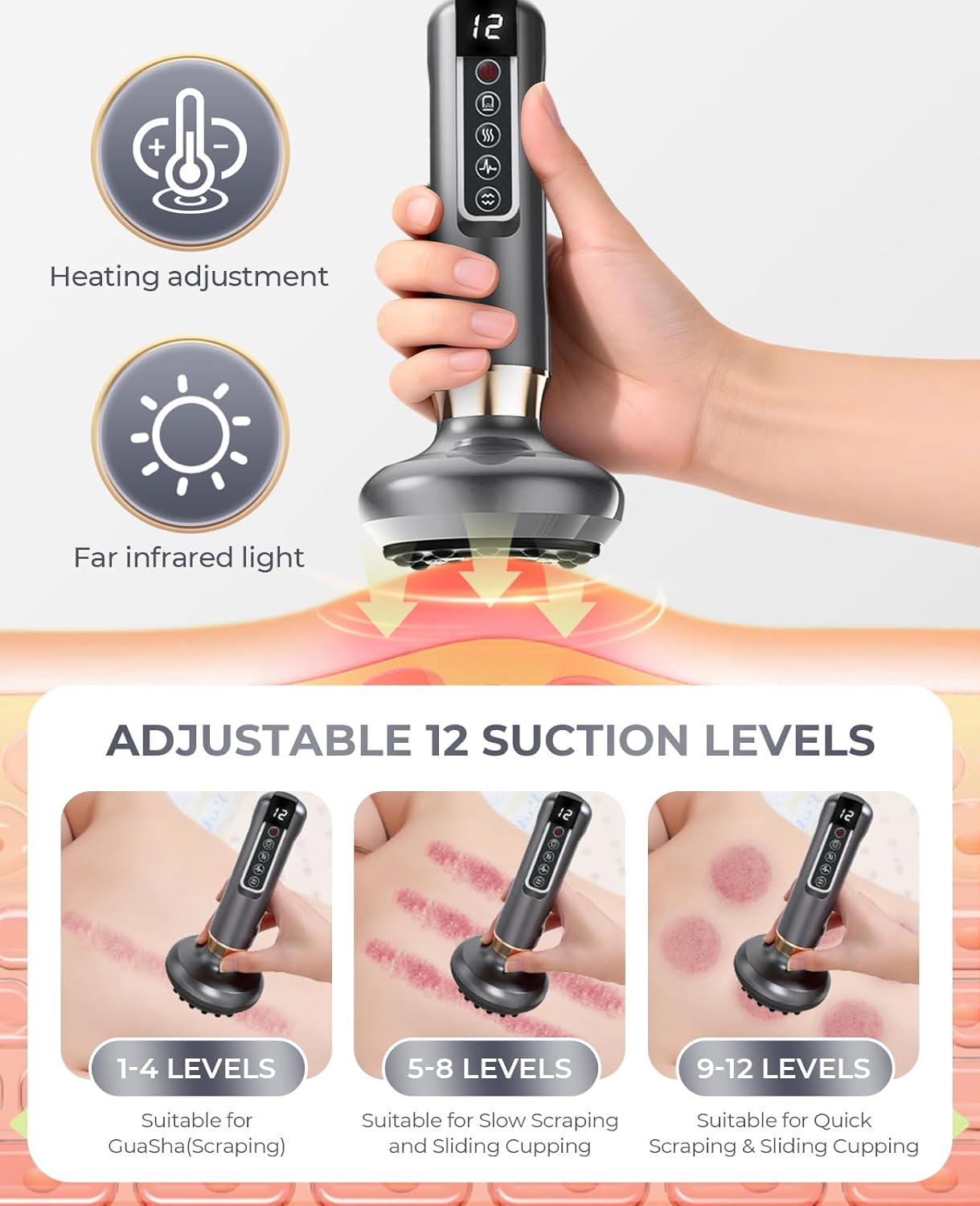 【12 Customizable Suction Modes for Personalized Treatment】 This cupping device features 12 adjustable suction levels, adapting to all your needs from gentle lymphatic drainage to deep muscle relief. As a versatile cellulite massage tool, it effectively reduces cellulite and revitalizes skin on arms, legs, buttocks and abdomen, making it an ideal at-home cupping machine for daily self-care.