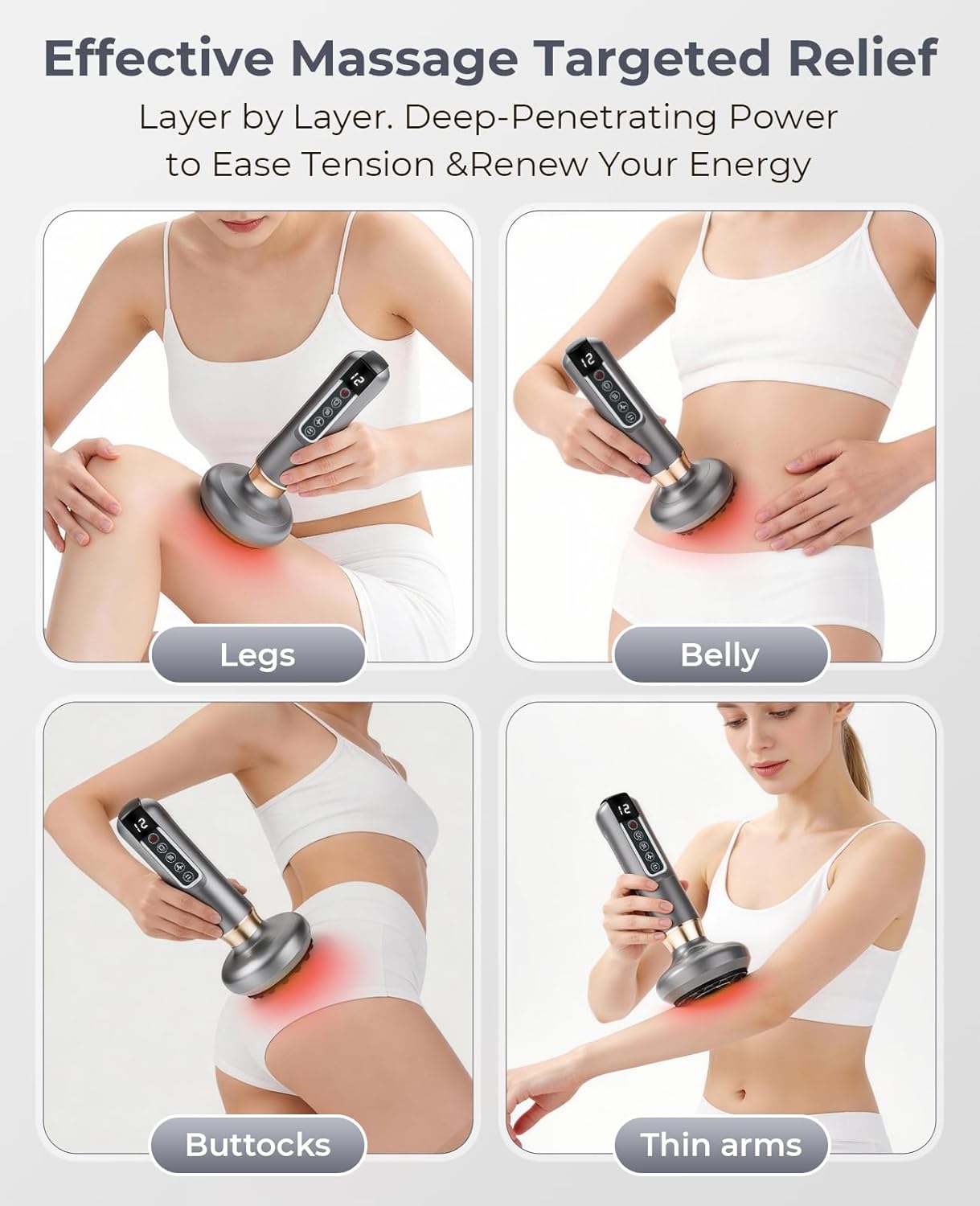 【Intense Muscle Relaxation & Targeted Body Contouring】 This electric cupping device combines professional cupping therapy with deep tissue massage, delivering a salon-quality SPA experience at home. As an effective cellulite massager, it precisely targets the abdomen, thighs, hips and back to relieve muscle soreness, boost blood circulation, and firm skin for a sleeker, more contoured silhouette.
