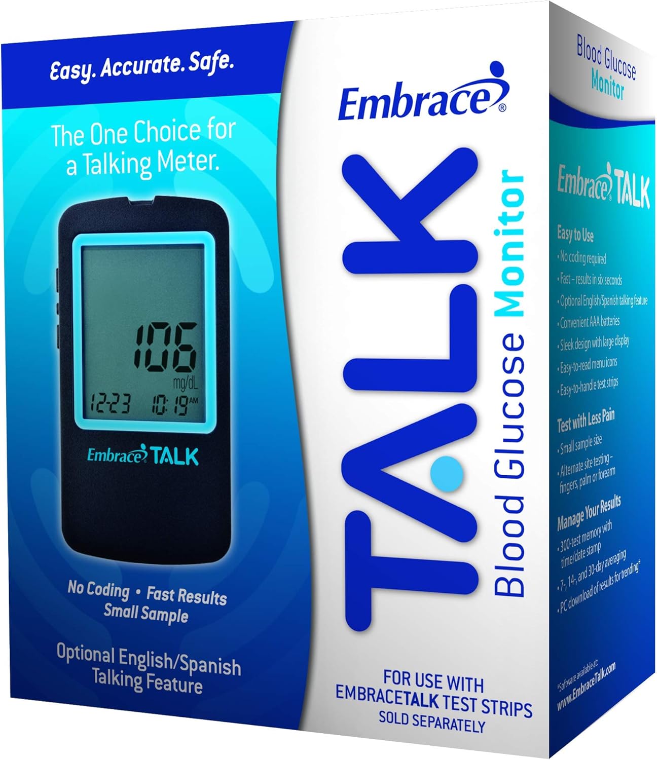 Embrace Talk Blood Glucose Meter (ONLY) 300-test Memory with time/date Stamp Uses 2 standard AAA Batteries (included) PC Downloadable Results Alternate Site Testing – fingers, palm, forearm 7, 14, and 30 Day Averaging Rubber Grips on the bottom prevent meter movement. Serial Number and Manufacturer Contact information on the back of the meter.