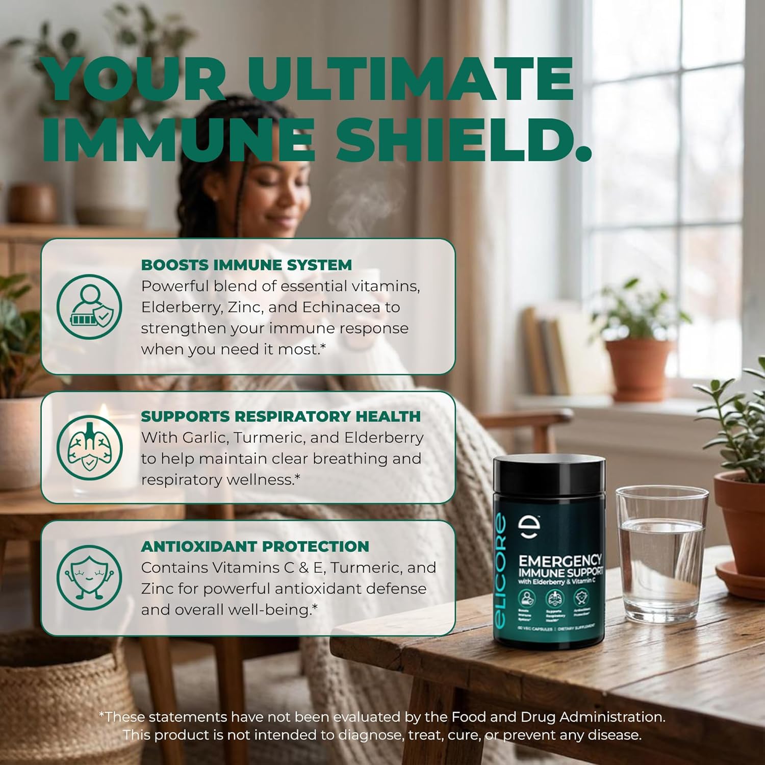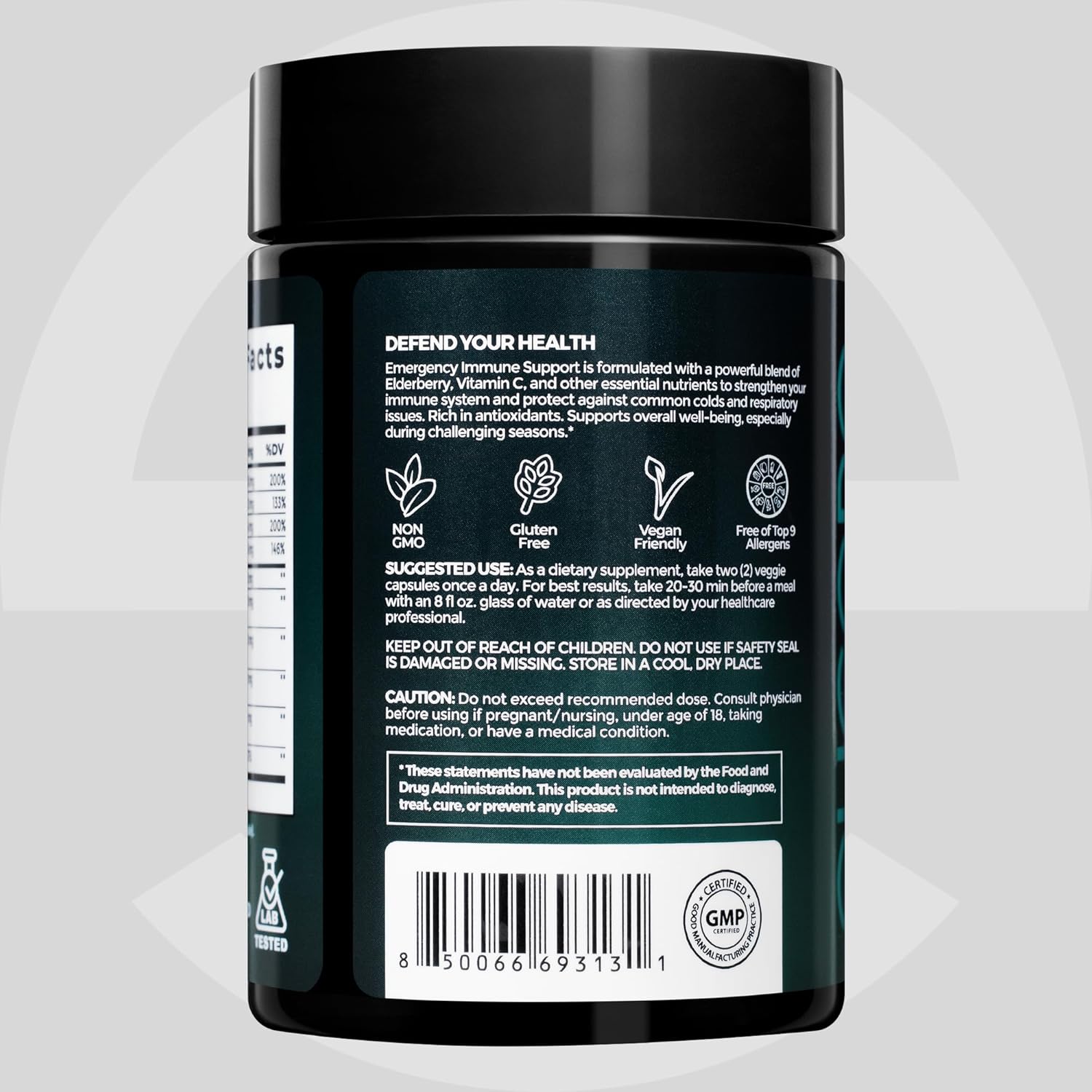 Emergency Immune Support Supplement – Vitamin C, E, B6, Zinc, Elderberry, Echinacea, Garlic & Turmeric – Immune Booster for Adults – Gluten Free, Sugar Free, Vegan Friendly – 60 Capsules