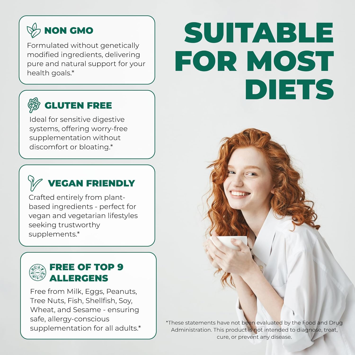 Suitable to Most Diets: Gluten free, sugar free, and vegan friendly, this supplement fits a wide range of dietary needs. Manufactured in the USA in an FDA-registered and GMP-certified facility, it’s designed for quality, purity, and trustworthiness.