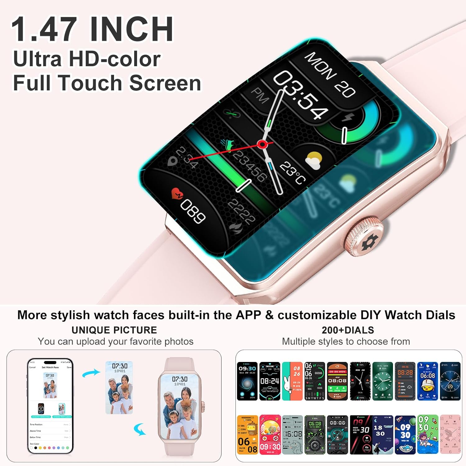 【1.47″ Ultra HD-color Full Touch Screen】 Fitness tracker with AMOLED HD Touch Color Screen curved-design, an exquisite visual display, provide you with high-quality touch and visual experience. There are more than 100+ dials watch face options for you to choose from in the App. You could also customize the smart watch face with photos from your own album. So it’s easy to find the right look for the right moment.