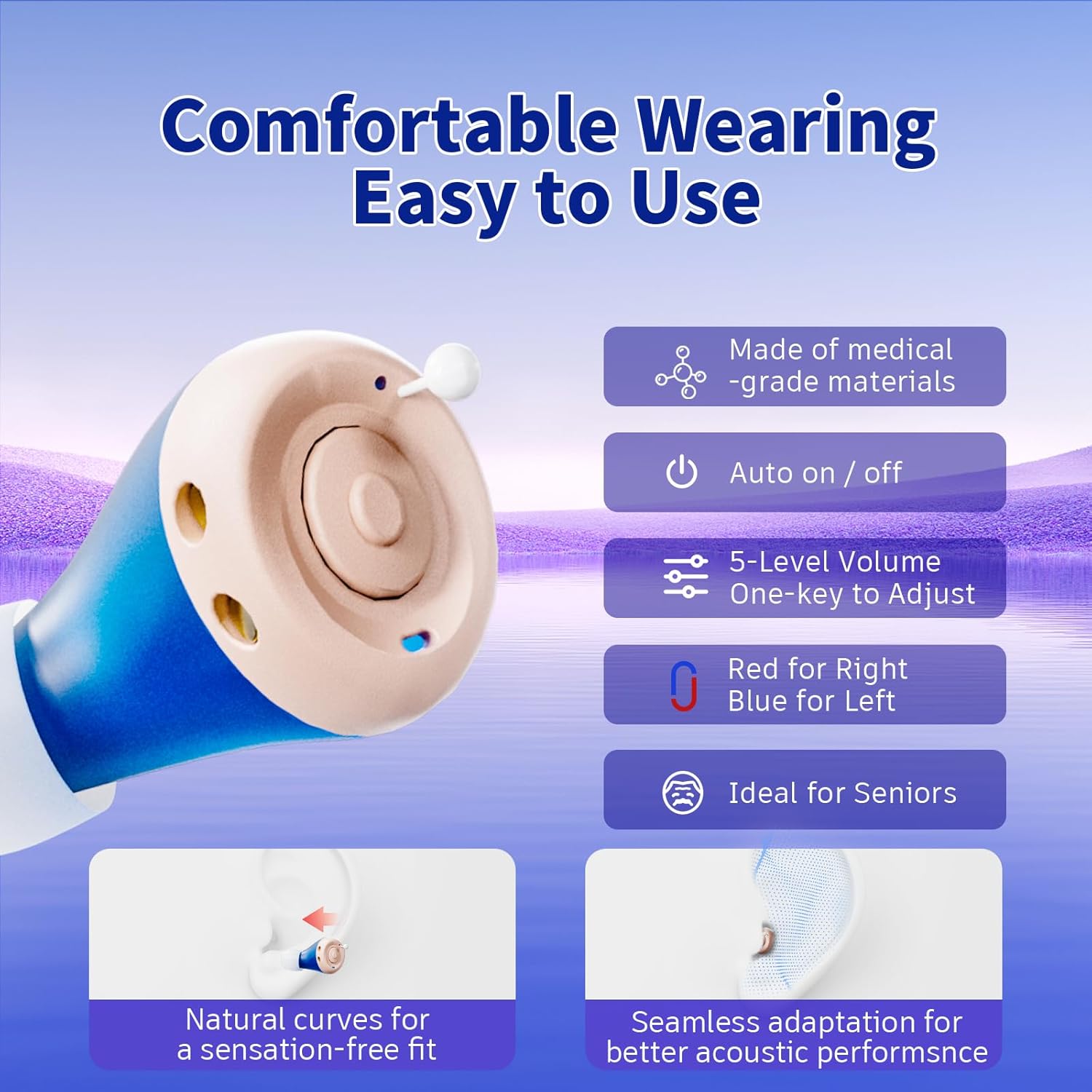 Easy Operation:The hearing aids designed for seniors with automatic power on/off. It will automatically turn on/off when taken out or placed back into the charging case. The hearing aid also has a sound memory function after use. Charging case designed with led light, you can visualize the charging status of the charging case and keep away from charging anxiety.
