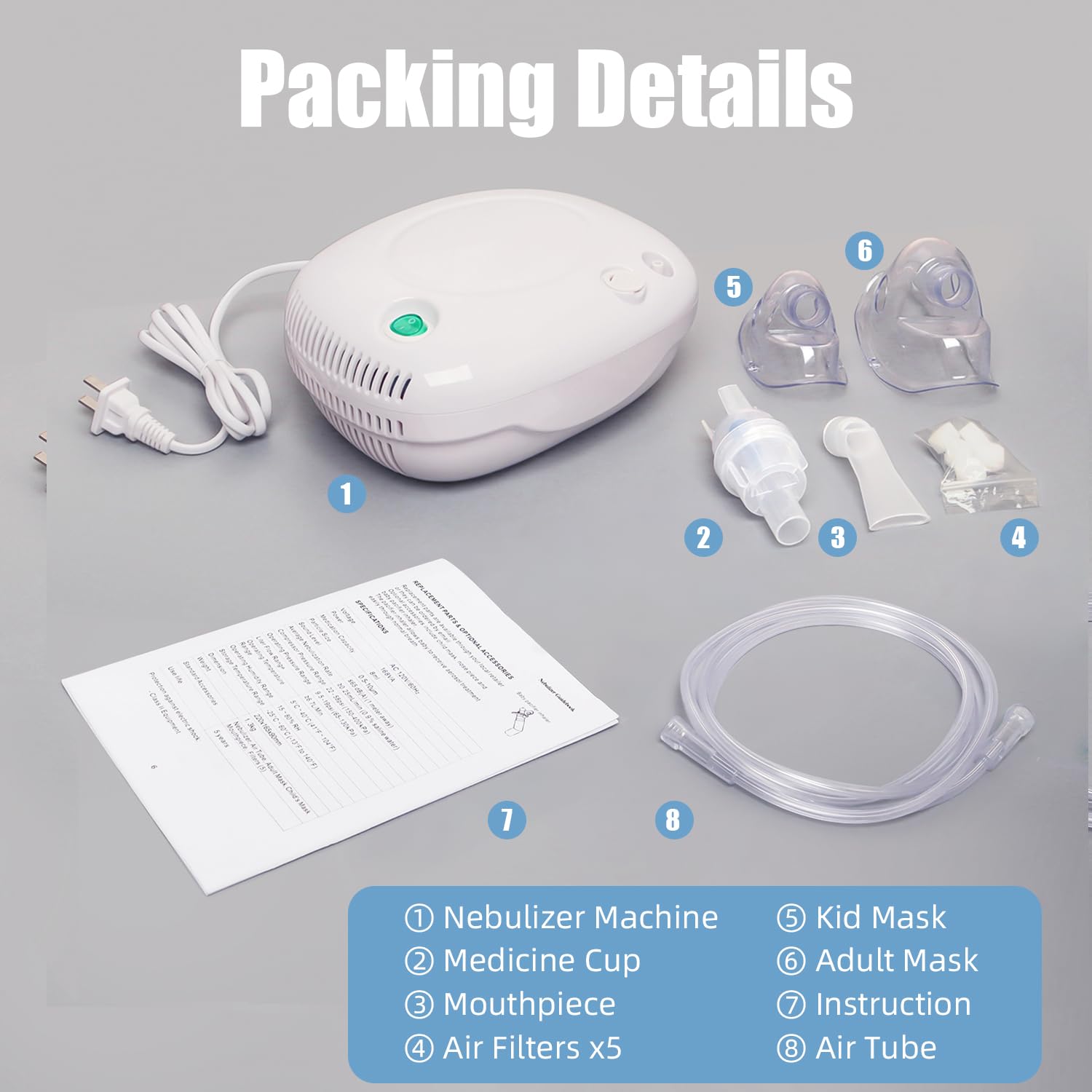 The nebulizer compressor is intended to be used to compress air and liquid medication into fine aerosol into the air that a patient will breathe so that it can effectively relieve various of respiratory symptoms.