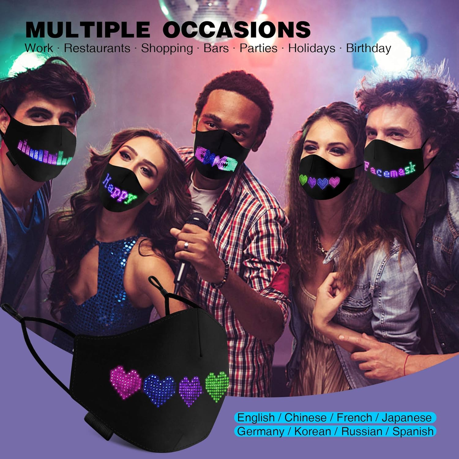 Can mask button control on the fixed pattern, but can be by phone APP DIY any content you want to display. And there are a variety of display modes, flashing, from left to right, from right to left, and so on