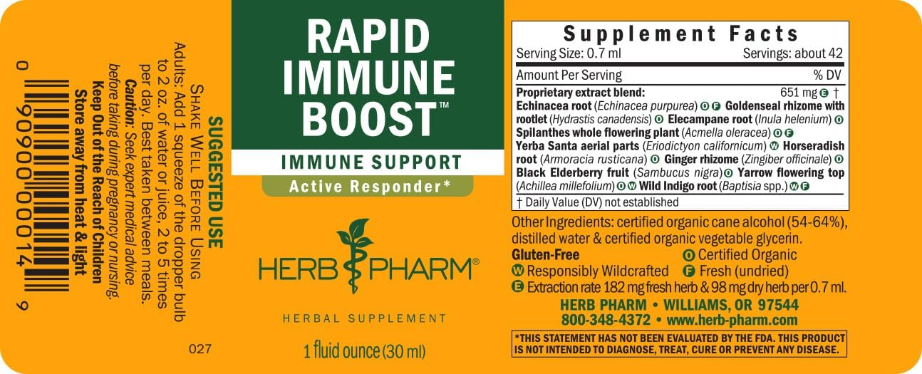 Rapid Immune Boost 1 oz LiquidDescriptionEchinacea-Goldenseal Compound BoostTM is Herb Pharms go-to product at the first sign of immune system distress* and is our best-selling immunity formula. This proprietary blend of 10 herbal extracts jump-starts the immune system to face its challengers.*NON-GMOGluten Free