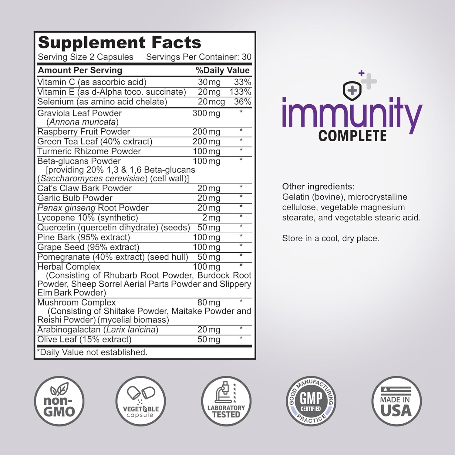 Immune Formula for Optimal Immune Support. A Maximum Strength blend of Vitamin C, Vitamin E, Selenium, Graviola, Red Raspberry Juice Extract, Green Tea (extract), Beta-Glucan, Curcumin, Cat’s Claw, Garlic, Korean Ginseng, Lycopene, Quercetin, Pine Bark, Pomegranate, Indian Rhubarb, Burdock Powder, Sheep Sorrel Powder, Slippery Elm Powder, Grape Seed (95% extract), Shitake Mushroom, Reishi Mushroom, Maitake Mushroom, ARA-6, Olive Leaf Extract.