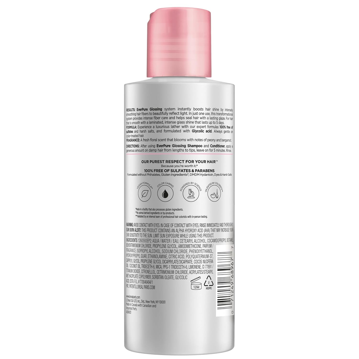 L’Oreal Paris EverPure Glossing hair care system, with glycolic acid, smooths and intensifies shine for color treated, processed, dry, dull and dehydrated hair while protecting color. For a glossy finish, use our EverPure Glossing sulfate free Shampoo and Conditioner, followed by our rinse out mask to seal hair for intense smoothness and a lasting glass shine. 100% Sulfate Free Shampoo, Conditioner, and Mask, Paraben Free, No Harsh Salts, No Phthalates, No Harsh Surfactants, Dye Free, Gluten Free*, Vegan Formula**. Validated by Colorists. Safe to use as daily hair care regimen. Our formulas are especially gentle on color treated hair.