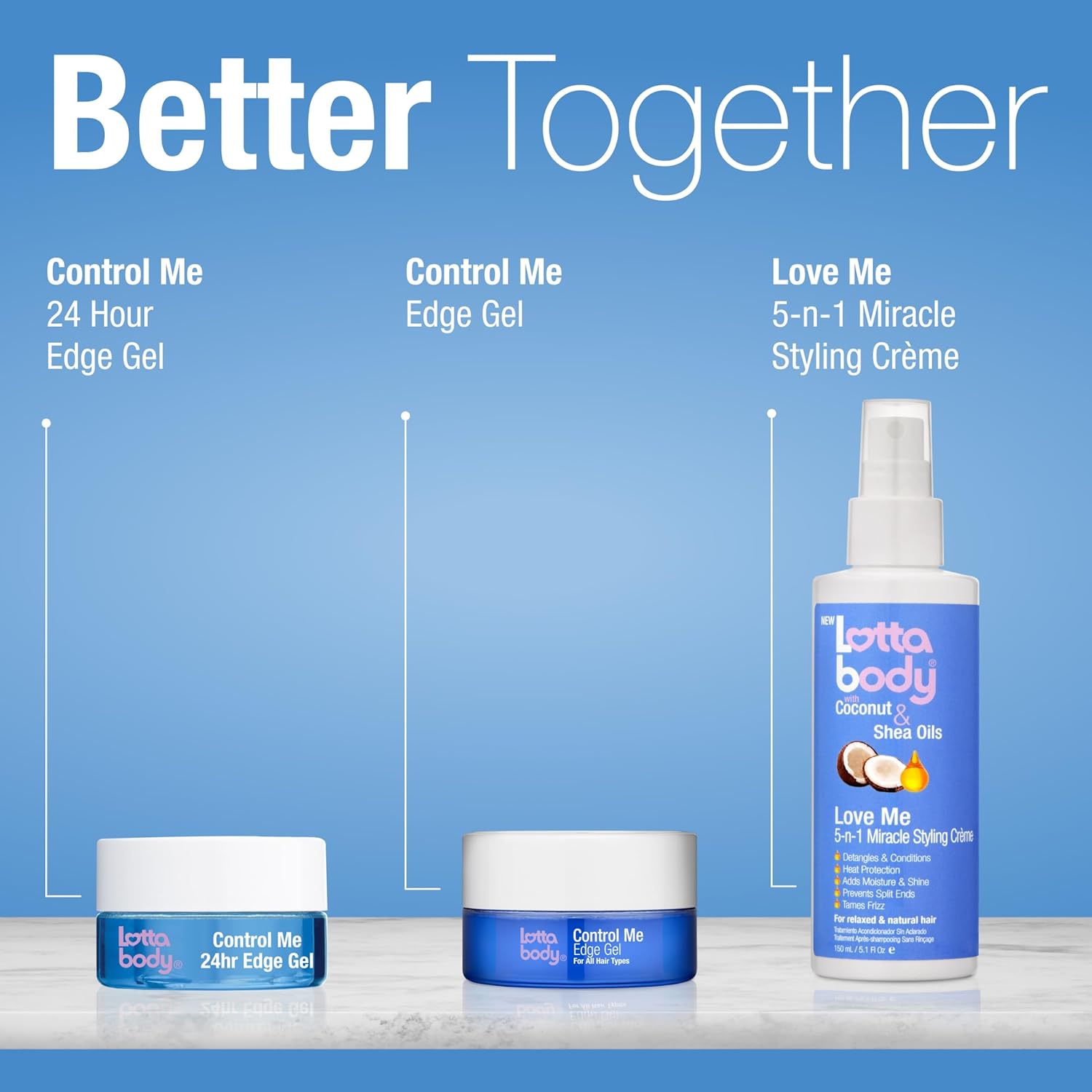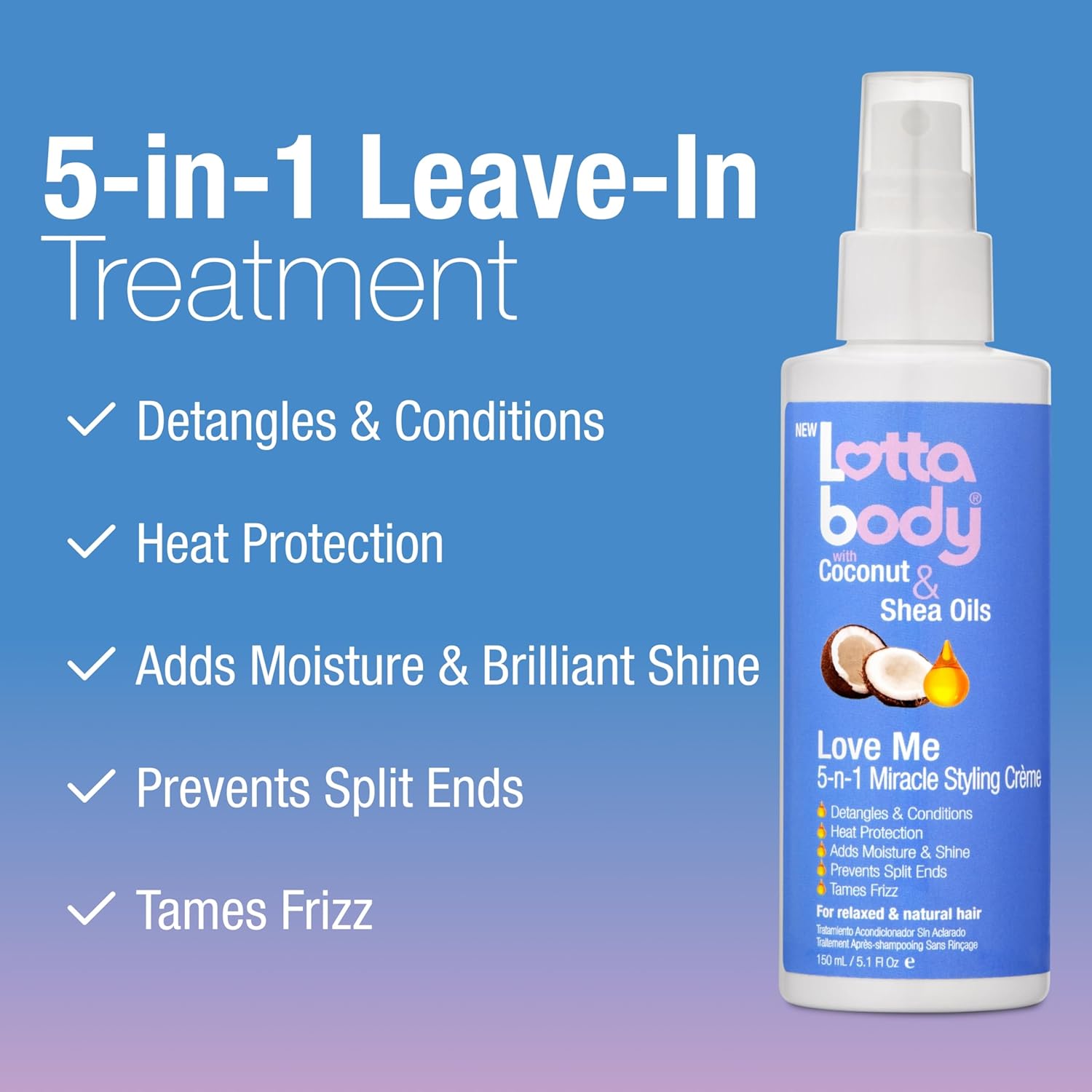 Lottabody Love Me 5-n-1 Leave-In Treatment is a multi-benefit treatment spray infused with coconut and shea oils, designed to detangle, condition and protect natural, relaxed or color-treated hair. This all-in-one formula helps provide heat protection, add lasting moisture and brilliant shine, tame frizz and prevent split ends. The lightweight leave-in mist can be used on damp, towel-dried or dry hair and combed through from roots to ends for smooth, manageable styling. Ideal for curls, coils, waves or relaxed textures, it supports daily maintenance, improves manageability and leaves strands soft and nourished without heaviness or residue.