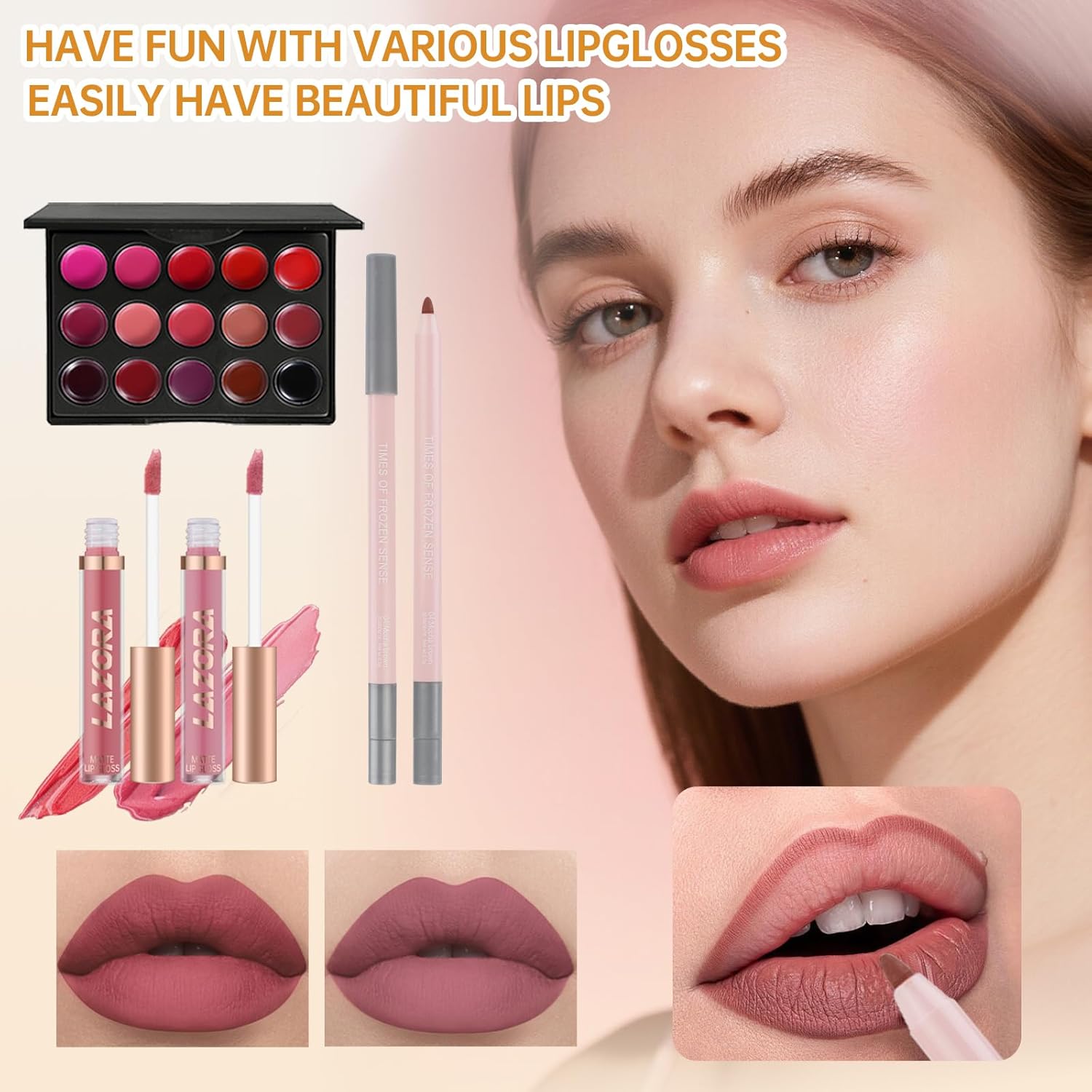 【All in One Makeup Kit】This Makeup Gift Set includes everything you need for a full-face look: facial cleansing brush ×1, foundation ×1, setting spray ×1, eyebrow pencil ×1, mascara ×1, eyeliner ×1, concealer ×1, lip liner ×1, lip gloss ×2, Lipstick Palette*1, makeup palette ×1, powder puff ×1, cosmetic brush ×8. Whether you are a makeup novice or a seasoned enthusiast, this toolkit perfectly meets your daily makeup needs
