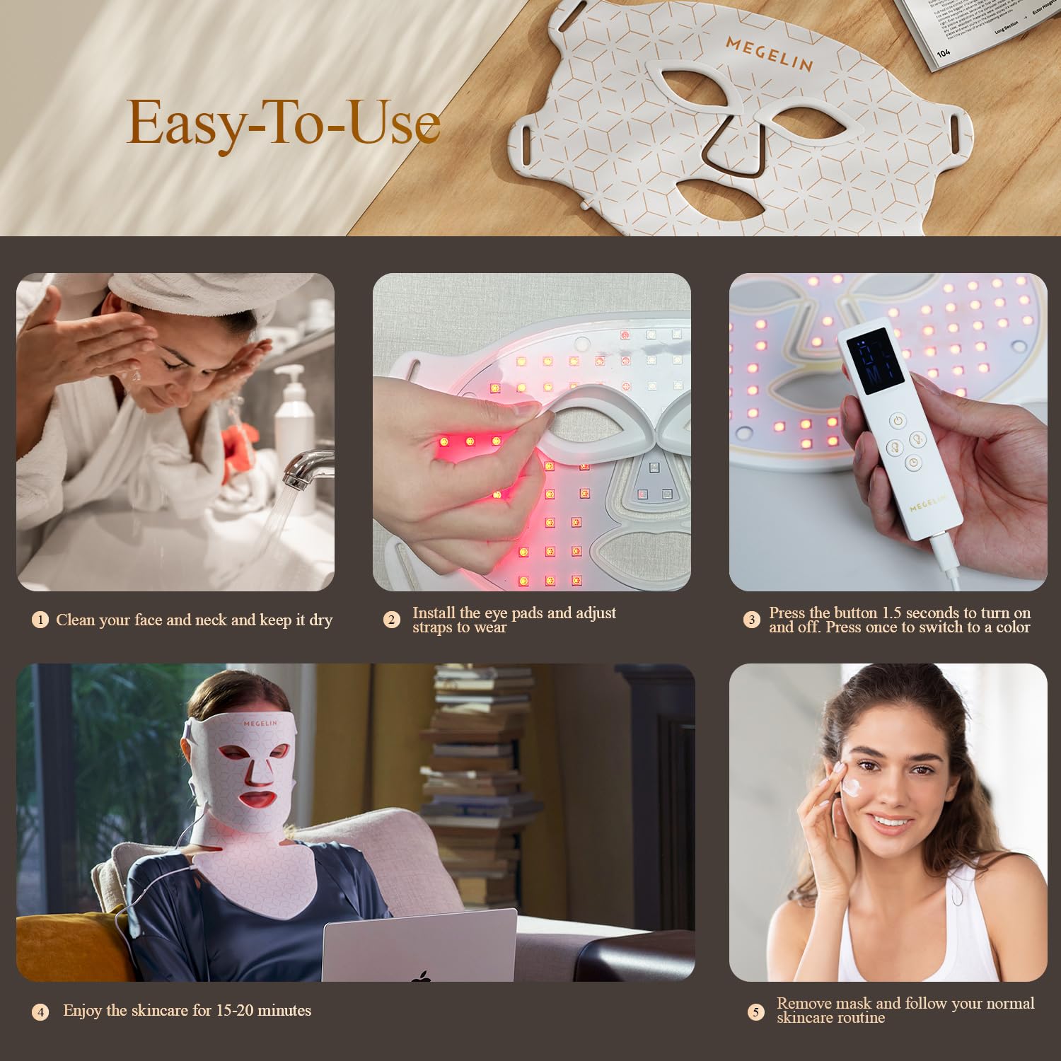 【Usage Frequency 】MEGELIN LED light therapy requires regular sessions to maintain results, It is recommended to use Facial Light Therapy 3-4 times a week, the single use time is 10-20 minutes. Continuous use for 4-6 weeks can help improve your skin condition. Results may vary due to individual skin differences.Note: Please do not use while charging
