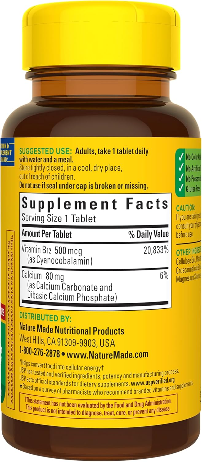 Nature Made Vitamin B12 500 mcg Tablets help break down food into energy that your body can use all day long. Sourced from high-quality ingredients, this B12 is a dietary supplement that is gluten-free and has no color added, no artificial flavors and no preservatives. This Nature Made B12 500 mcg supplement helps support energy metabolism(1), healthy aging and a healthy mood(2). This daily dietary supplement is made for adults to take by mouth with water and a meal at home or on the go and fits perfectly into any supplement user’s routine. Nature Made vitamins are quality you can trust. USP has tested and verified ingredients, potency and manufacturing process. USP sets official standards for dietary supplements. Visit the USP verified website for more information. (1)Helps convert food into cellular energy. (2)Adequate Vitamin B12 status helps support a healthy mood. *Based on a survey of pharmacists who recommend branded vitamins and supplements. These statements have not been evaluated by the Food and Drug Administration. This product is not intended to diagnose, treat, cure or prevent any disease.