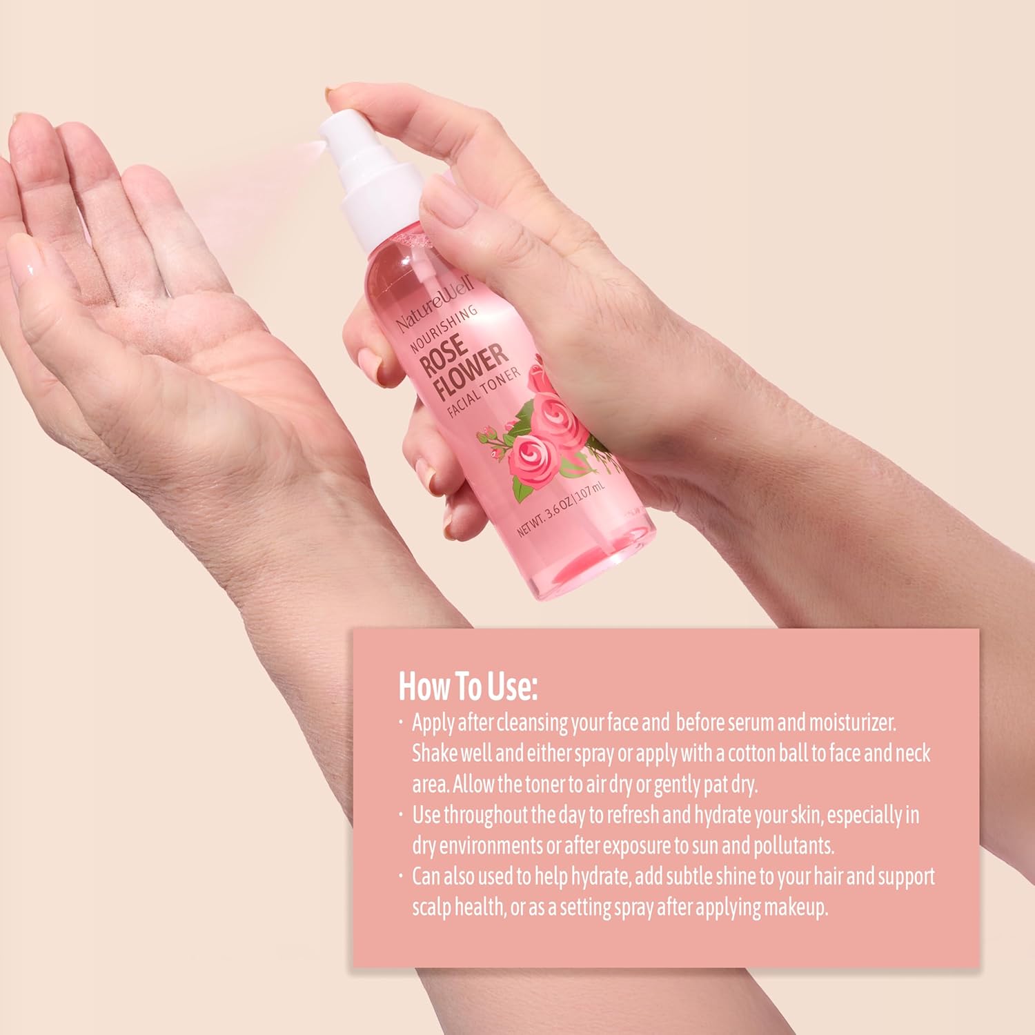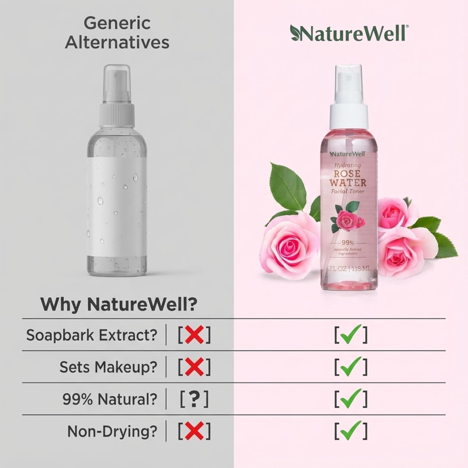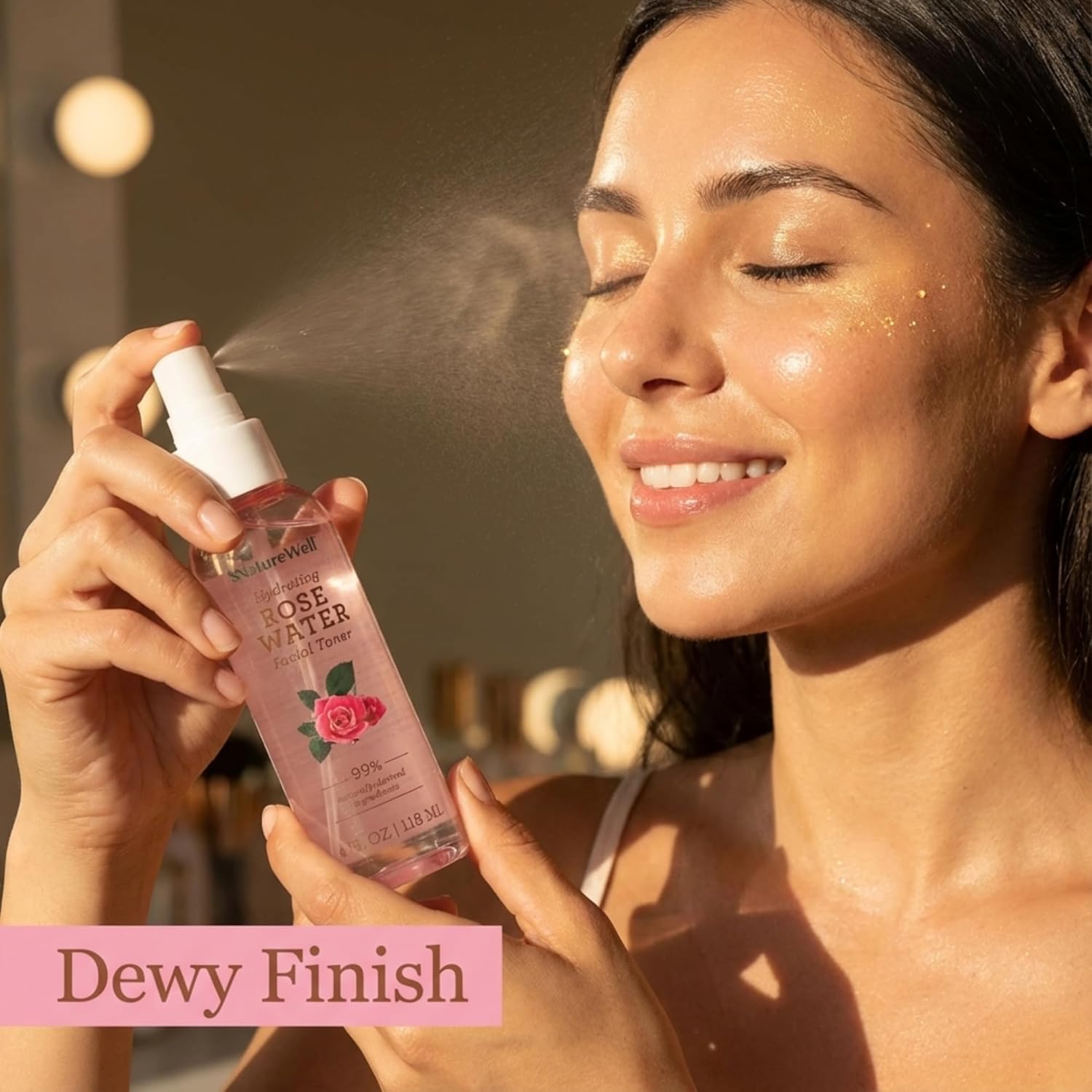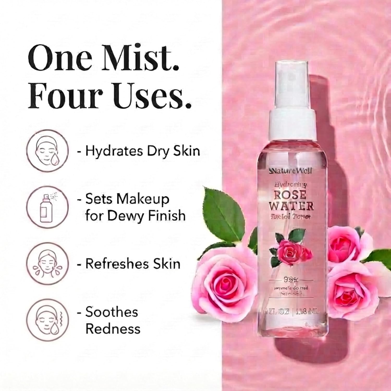 NATURE WELL Rose Water Hydrating Facial Toner Mist for Dewy & Radiant Skin, Refreshing, Conditioning, Soothing, Moisturizing, Perfect for Travel, 4 Fl Oz