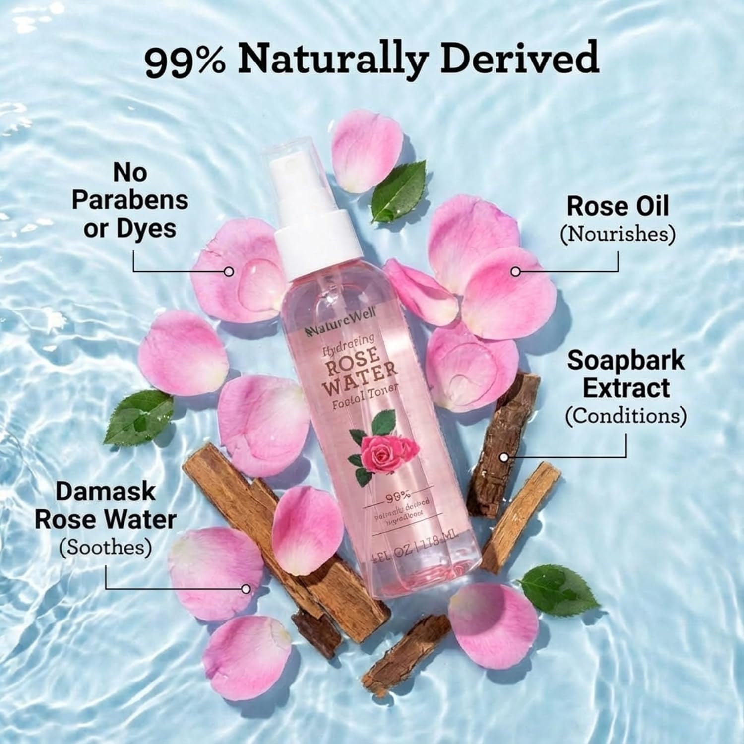 ROSE WATER: Made with a rich blend of Rose Water, Rose Oil, and Soapbark Extract for maximum hydration and soothing benefits. This formula conditions, tones, and keeps skin moisturized throughout the day.