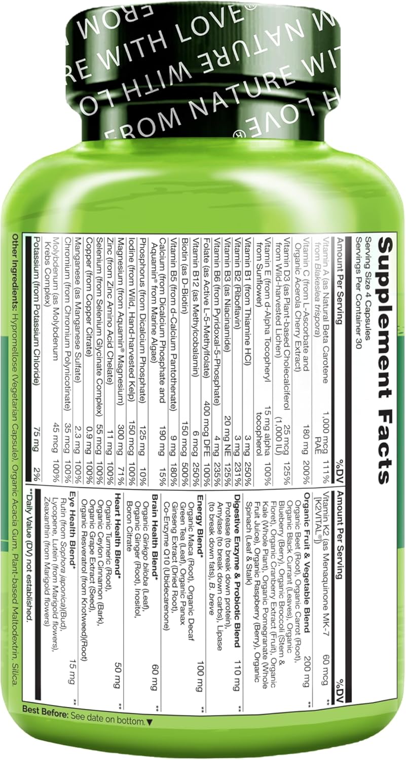 ANTIOXIDANT BOOST: Our mens vitamins multivitamin includes antioxidant botanicals like turmeric, ginseng, and green tea, along with health blends to help support brain, eye and heart health.* This makes it an ideal multivitamin for men.