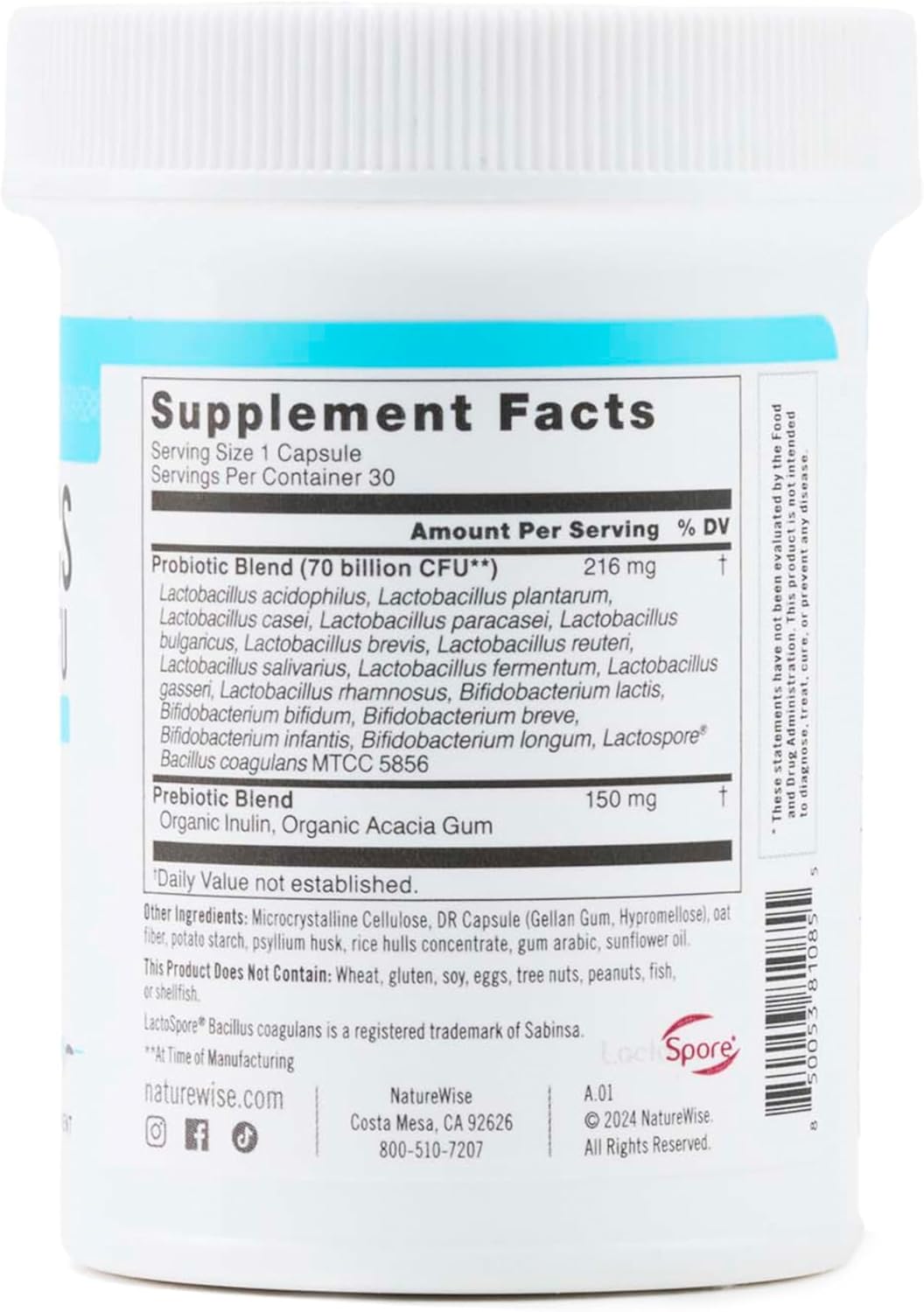 NatureWise 70 Billion CFU Probiotics is one of the highest-strength probiotics on the market, with 70 billion colony-forming units (CFUs) of gut-healthy bacteria to support your daily digestion, gut health and immune health.* This advanced probiotic supplement contains 17 different effective probiotic strains including LactoSpore®, Lactobacillus acidophilus, Lactobacillus plantarum, Lactobacillus paracasei, Lactobacillus bulgaricus, Lactobacillus brevis, Lactobacillus reuteri, and more. What sets this advanced probiotic supplement apart from the rest is the addition of organic prebiotics. Prebiotics act as fuel for probiotics to do their job. We’ve combined organic acacia gum and inulin, plant-based prebiotics to give you a balanced probiotic supplement with prebiotics included. Having prebiotics and probiotics together can help you maintain a healthy gut and digestion.* Our probiotics also come in CSP™ bottles, which are shelf-stable bottles that keep out light and moisture out, ensuring better product stability and potency over traditional bottles with a desiccant canister or sachet. This means your probiotics will stay alive at room temperature – no refrigeration needed. NatureWise 70 Billion CFU Probiotics use delayed-release capsules, which are powerful enough to survive harsh stomach acids. Stomach acids can destroy majority of probiotics before they ever reach the lower GI tract where they are most needed. This technology delays the release of these beneficial probiotics in your system – right to where they’re needed in the gut. This advanced probiotic supplement has a delivery system that ensures your probiotics will survive corrosive gastric acids to reach their targeted destination. Support your digestive health, gut health, and immune health with this advanced probiotic formula made with beneficial probiotic strains. NatureWise 70 Billion CFU Probiotics are vegetarian, and do not contain GMOs, gluten, wheat, or soy. These probiotic supplements are proudly manufactured in USA-based facilities that comply with the strictest cGMP standards and are carefully tested by third-party laboratories for purity and potency. *Statements regarding dietary supplements have not been evaluated by the FDA and are not intended to diagnose, treat, cure, or prevent any disease or health condition.