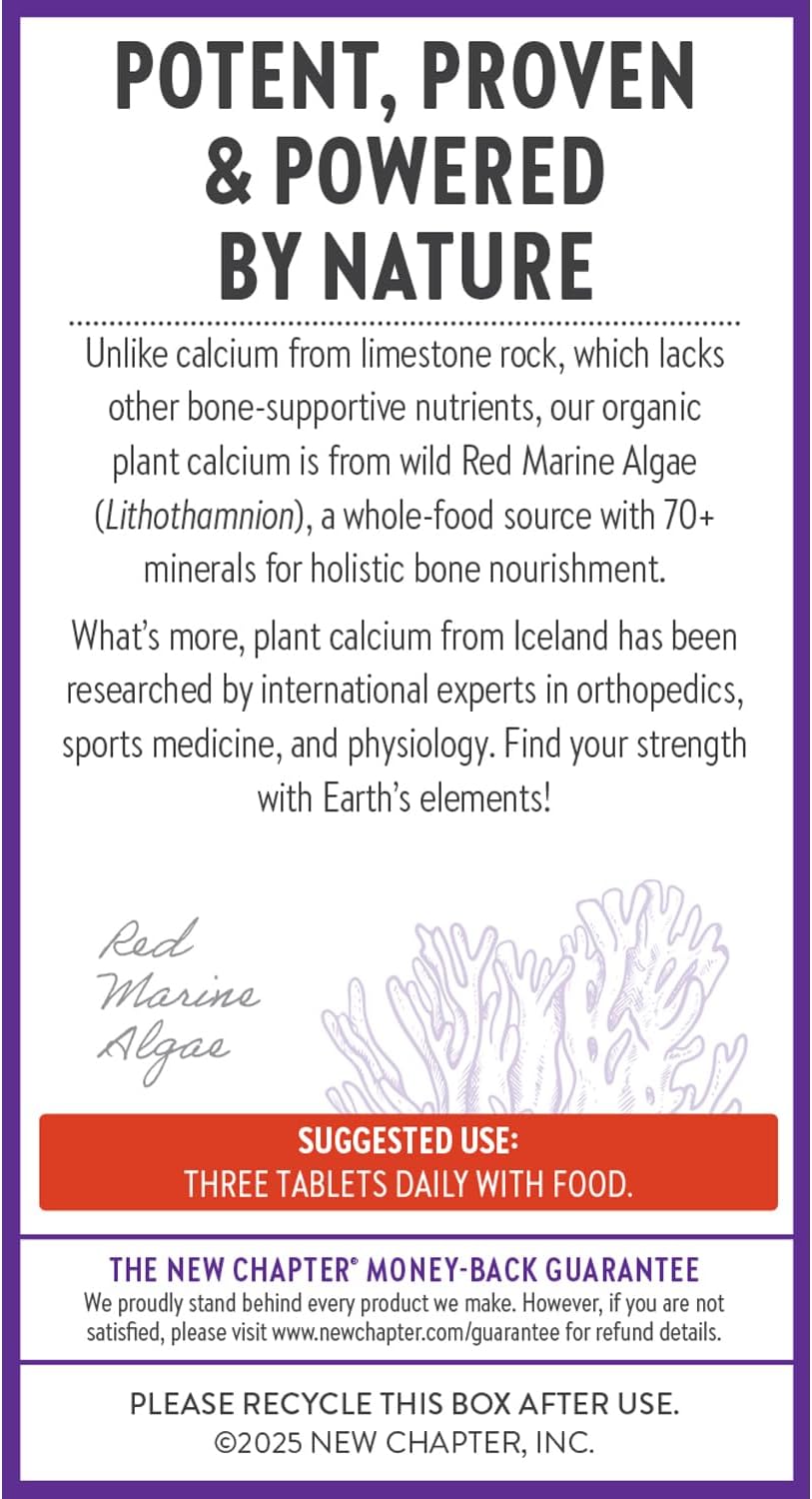 For New Chapter’s organic plant calcium, we travel to Iceland where Red Marine Algae grows rich in calcium plus naturally occurring magnesium and 70+ trace minerals. This plant calcium from Iceland has been researched by international experts in orthopedics, sports medicine, and physiology. And of course we want your body to use that calcium effectively, so we add a proprietary blend of vitamin K2 and D3 that directs calcium right to your bones where you need it, which also helps to maintain artery health.* This is a very different story than your standard calcium carbonate that comes from limestone rock. Experience the magic inside our clinical-strength dose of organic plant calcium for 3-in-1 benefits: strong bones & teeth, joint function & mobility, and heart health.* *These statements have not been evaluated by the Food and Drug Administration. This product is not intended to diagnose, treat, cure, or prevent any disease.