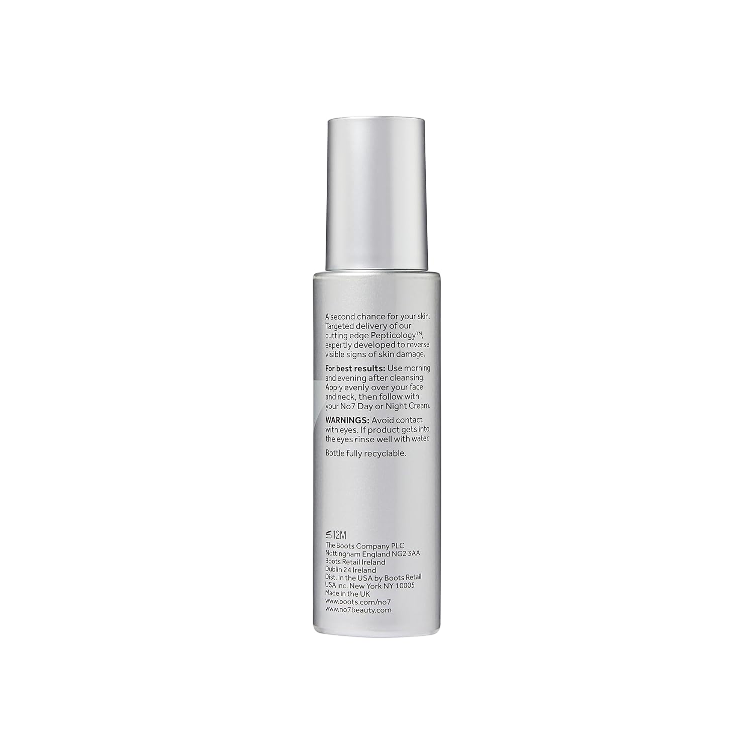Peptide Technology – This peptide serum is formulated with Pepticology, No7’s patent-pending technology to target visible signs of skin damage, delivering advanced repair and improved radiance