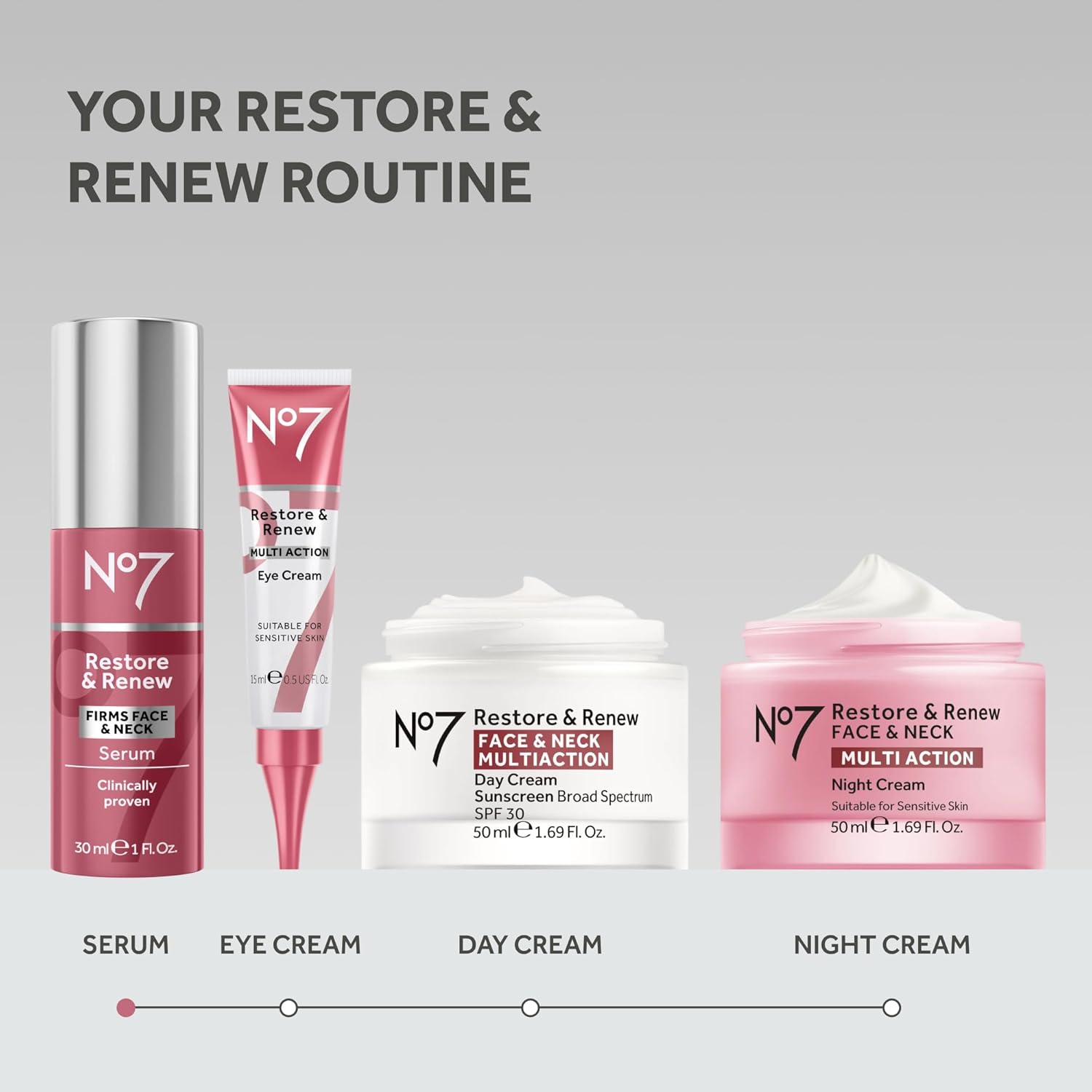 How to Use – Use this skin firming serum in the morning and evening as part of your daily skincare routine. Smooth serum onto face and neck, followed by the Restore & Renew Multi-Action Eye Cream.