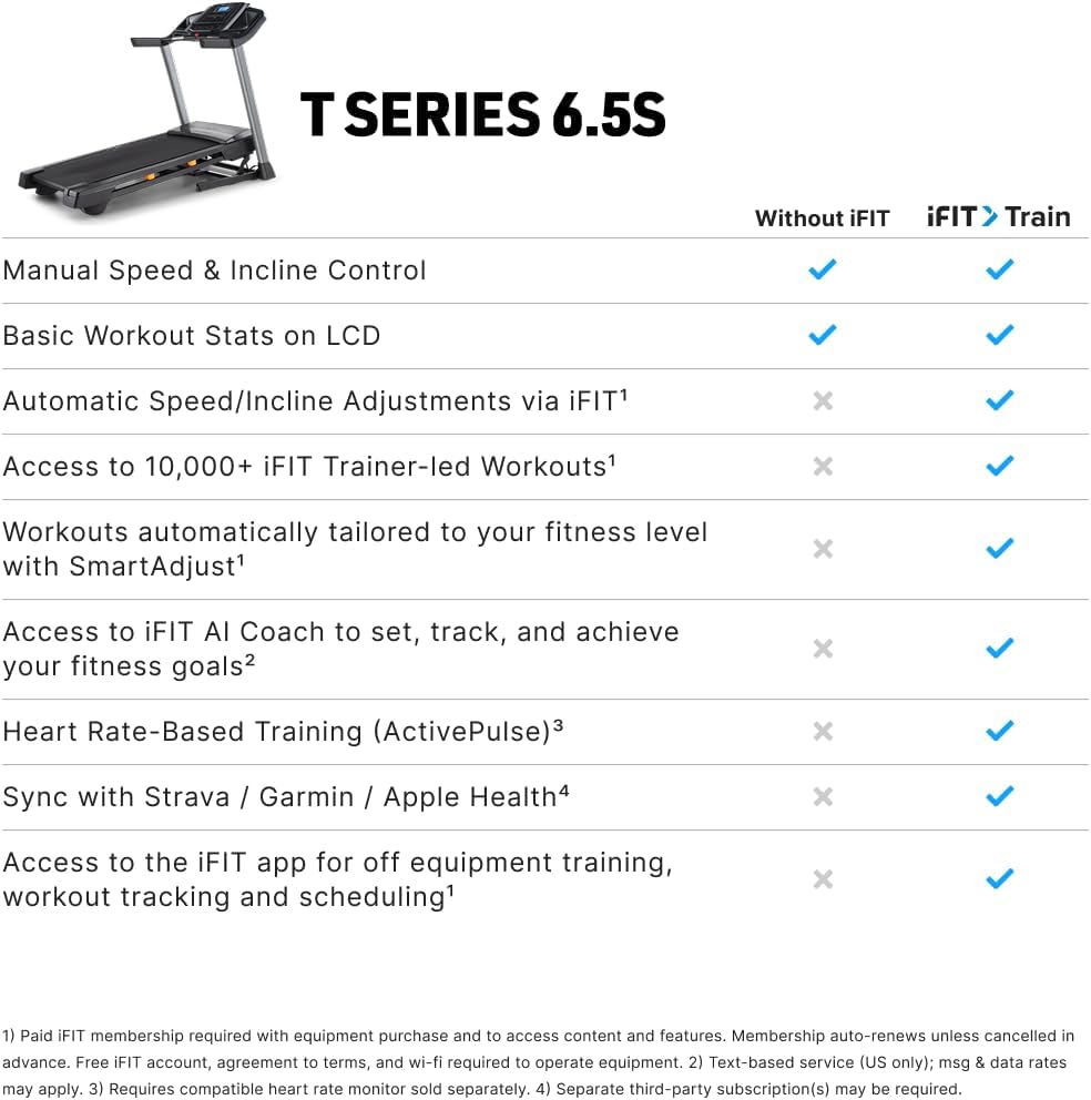 [SmartAdjust] – iFIT’s SmartAdjust automatically adapts your treadmill’s speed and incline in real time based on your workout history and performance. The more you train, the more your workouts evolve. (Train Membership Required)
