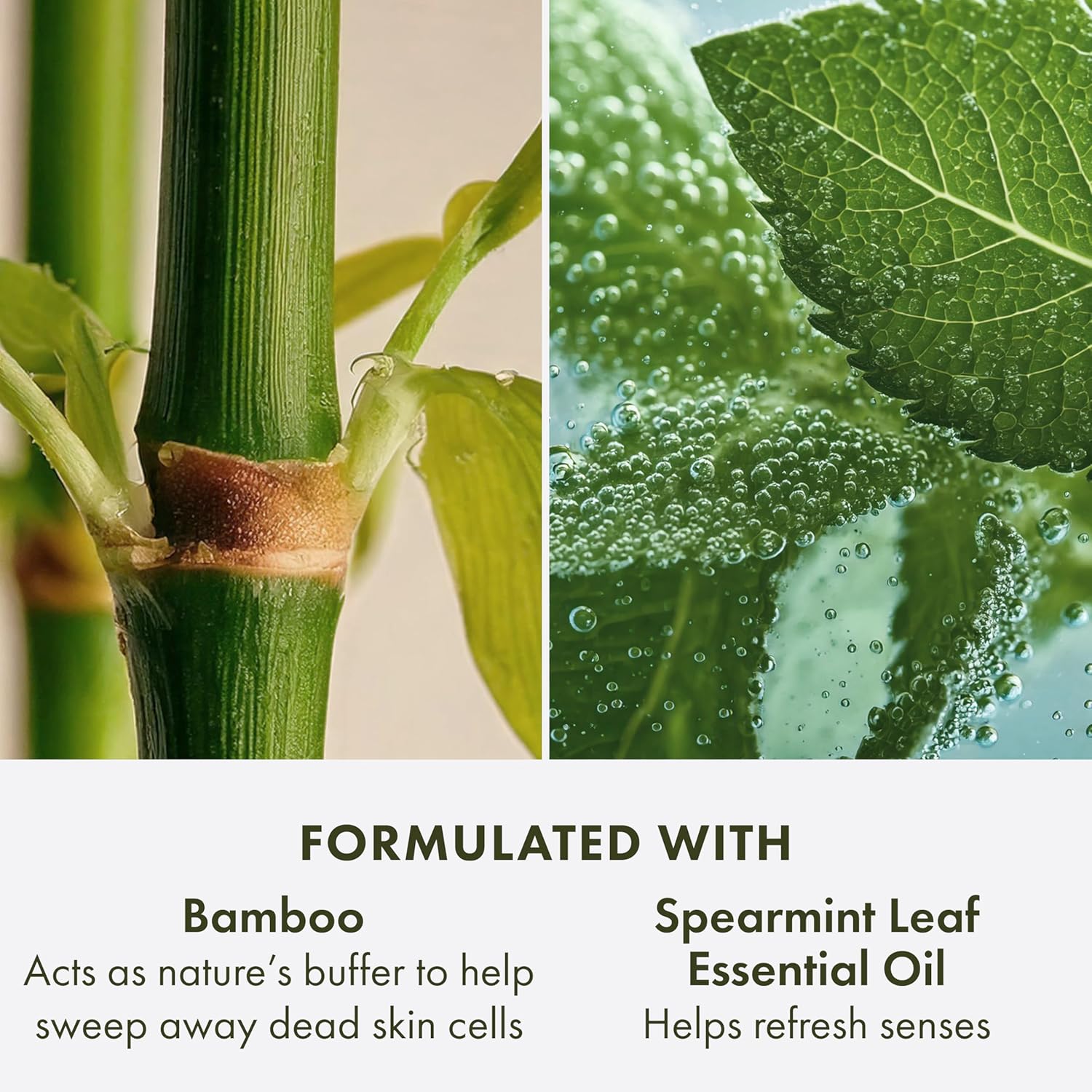 KEY INGREDIENTS: Bamboo acts as nature’s buffer to help sweep away dead skin cells; Mineral Silica works as nature’s gentle and effective skin polisher to help clear and unclog pores; and Spearmint Leaf Essential Oil helps refresh senses.