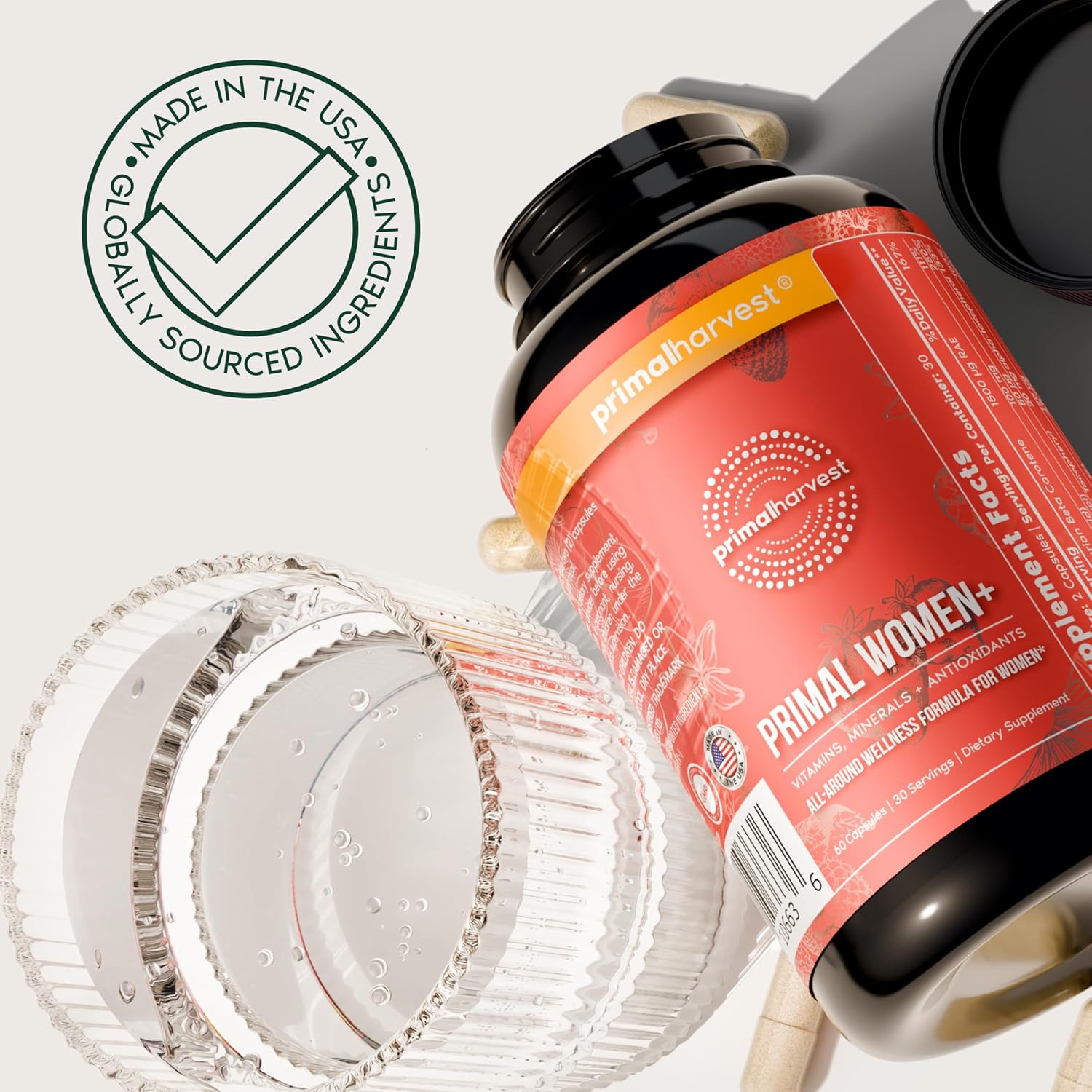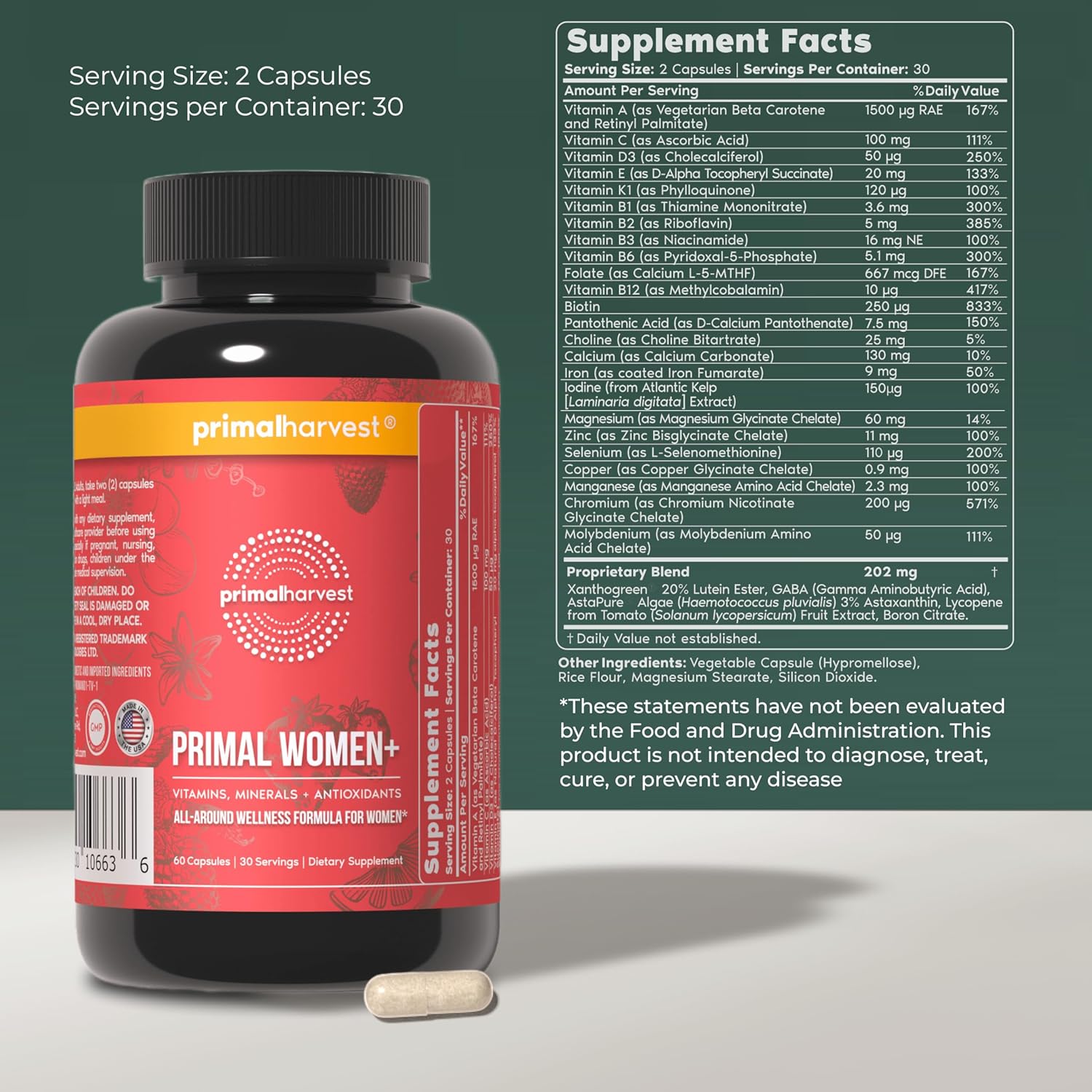 Primal Harvest Women+, Woman’s Multivitamin Vitamin A, Vitamin C, Vitamin D and E, Vitamin B12, B6, Biotin, Zinc Supplements,1 Pack 60 Capsules
