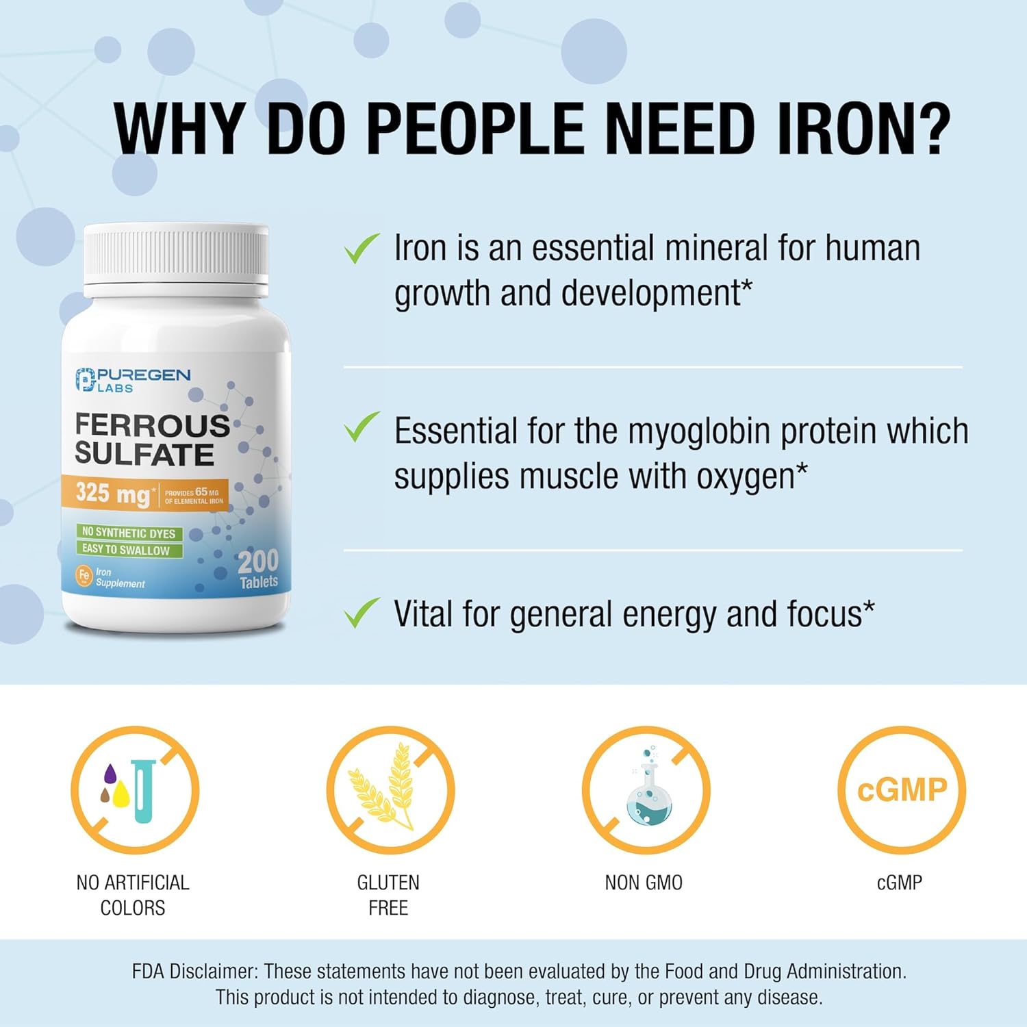 ✔️ ACTIVE INGREDIENT: This Puregen Ferrous Sulfate supplement is an Iron deficiency supplement that is vital for red blood cell formation and supports healthy cognitive function.