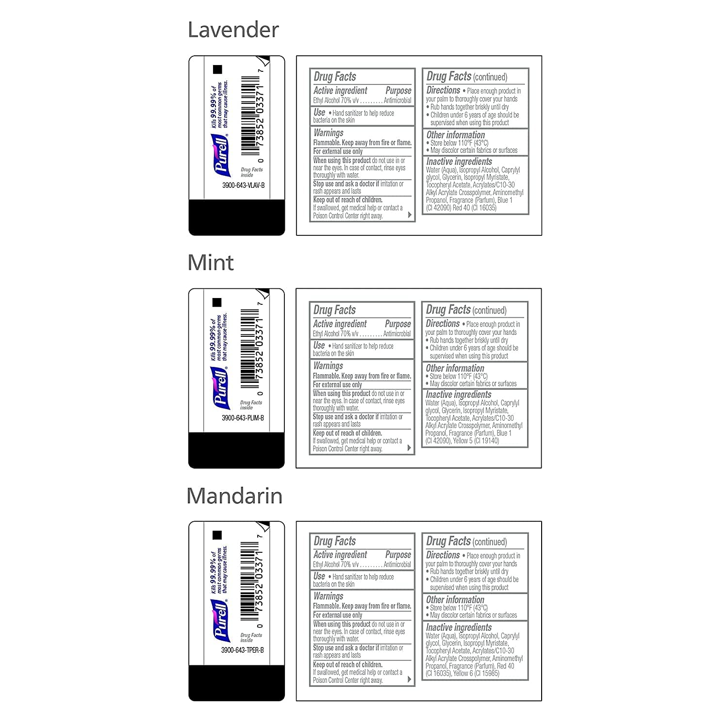 Case Includes 8 – PURELL Advanced Hand Sanitizer Essentials, Infused with Essential Oils – 1 fl oz in three fragrances: (3) Mandarin, (3) Lavender, and (2) Mint bottles. Due to high demand, included JELLY WRAP Carriers may vary in color