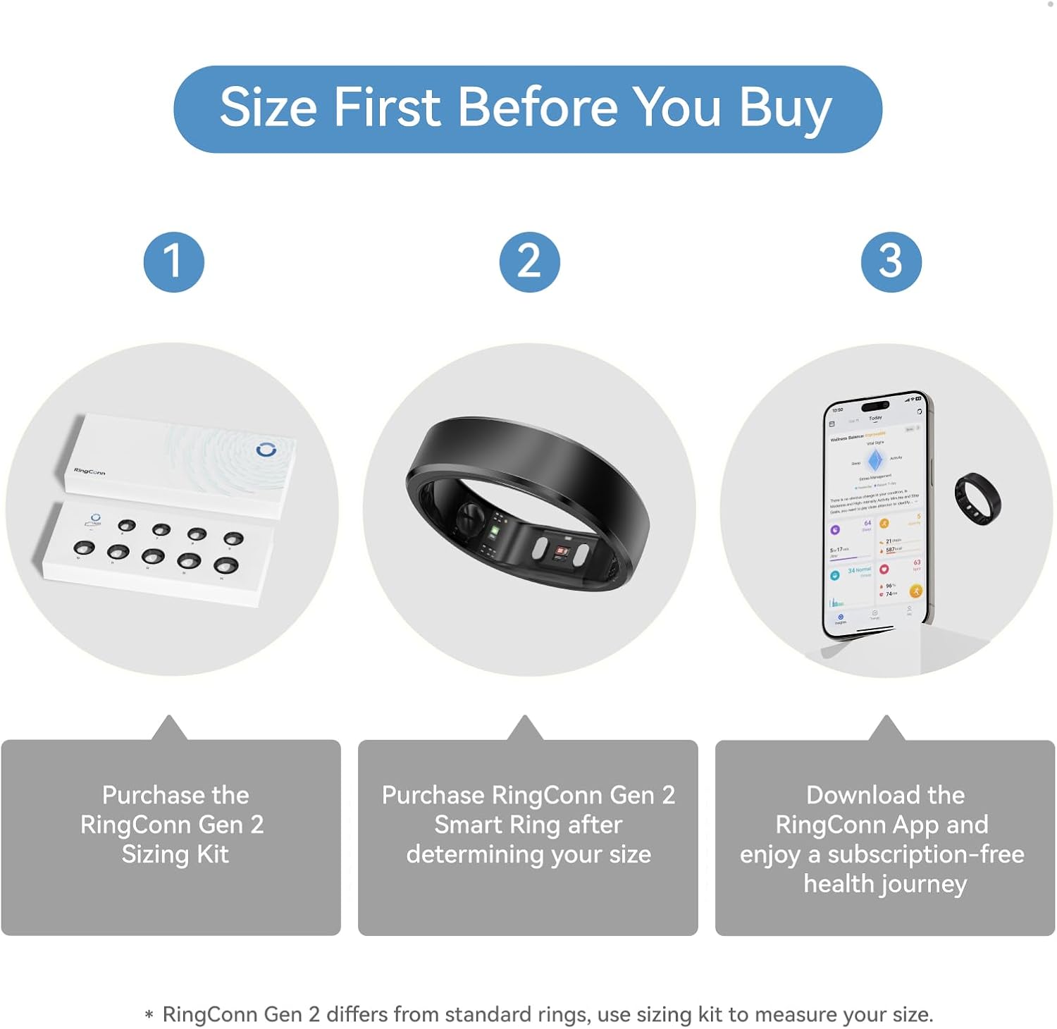 [Size Before You Buy] RingConn Gen 2 Smart Ring uses unique sizing standards, different from U.S. and other health rings. RingConn Gen 2 Sizing Kit helps you find the most comfortable and accurate fit for your finger, preventing the inconvenience of returns and exchanges by ensuring you select the correct size before purchasing